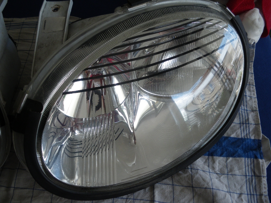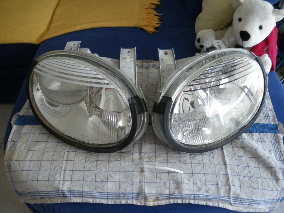 Ein "Böser Blick" wie er typisch ist, durch Verlängerung der Haube, oder einem Kunststoffaufsatz, kam für mich eigentlich nie in Frage. Dadurch das ich aber Schwarze Scheinwerfer zum weißen Lack habe, wirkte die Front ein wenig "Glubschäugig". Für mich war das Ziel, die Front, speziell die Scheinwerfer, etwas Grimmiger erscheinen zu lassen, ohne das Design zu manipulieren oder zu "zerstören". Ein erster Gedanke, wie ich das umsetzen konnte lieferte mir MG selber. In dem Scheinwerferglas sind "Streifen" eingearbeitet. Mmmh... die Idee fand ich gar nicht dumm... Dann ist mir immer mal wieder die E-klasse (2. Modell mit den runden Doppelscheinwerfern) aufgefallen. Dieser hatte nach dem Facelift eine art Jalousie über den Blinkern, sprich im oberen Teil des Scheinwerfer's. Bingo... das ist es... Aber wie umsetzen? Um erste Versuche zu unternehmen, und den Aufwand erst mal gering zu halten, fiel die Wahl auf Klebeband. In Wagenfarbe... Da es nirgends so schnell (man hats ja immer eilig, wenn man ne Idee hat  ) weißes Klebeband in 3mm Stärke zu finden war, wurde für die ersten Versuche Schwarzes genommen... Naja, war mein Fazit, auf Chrom irgendwie "OK", aber nicht das was ich mir vorgestellt hatte... So kam 6mm weißes zum Einsatz. Auf Chrom sah es eher komisch aus, aber auf Schwarzen Scheinwerfern mußte es einfach gut aussehen. Wie es geworden ist seht ihr an den Bildern. Mein Fazit: 1 - Die Idee ist genial... gefällt mir. 2 - Trotz Bedenken, keinerlei Lichtverlust feststellbar. 3 - Die ganze Sache wird noch verfeinert, da das Klebeband im Scheinwerfer angebracht wurde, und somit nicht um die Ecken gehen konnte. Hier werde ich sicher noch Nacharbeiten, probieren, und die Sache perfekt machen... PS: Wie gefällt's den so