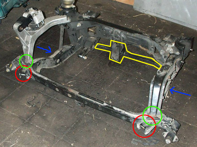 Im Prinzip bedeutet dies, den unteren Querlenker und die Zugstange der MG F-Aufhängung sowie die Radnabe zu entfernen. Dann müssten am Hilfsrahmen die Aufnahmen der Zugstangen (rot in der Zeichnung) abgeflext werden. Die Aufnahmen des TF-Längslenkers werden an den vorderen Befestigungspunkten der Motorträger mit verschraubt (grün). Das ist also schon vorhanden. Die unteren Spurstangen ersetzen quasi den bisherigen Querlenker, so wie es aussieht sind die Befestigungspunkte hier auch identisch (blaue Pfeile). Soweit - so gut. Die oberen Querlenker vom MG F würden bleiben, genau wie auch der Stabilisator, die Stoßdämpfer und die Hydragaseinheiten. In die Radnabe müssten dann natürlich oben das flache Traggelenk vom MG F in die TF-Nabe reingeschraubt werden, damit die Distanz wieder passt. Bleiben noch die hinteren Spurstangen, die beim TF ja länger und anders aufgehängt sind. Da gibt es nun die Frage: Entweder man verwendet die kurzen Spurstangen vom MG F an den originalen Punkten am Hilfsrahmen weiter oder man entfernt beim MG F-Rahmen die hintere untere Querstrebe samt Wagenheberaufnahme (gelb im folgenden Bild): Dateianhang: