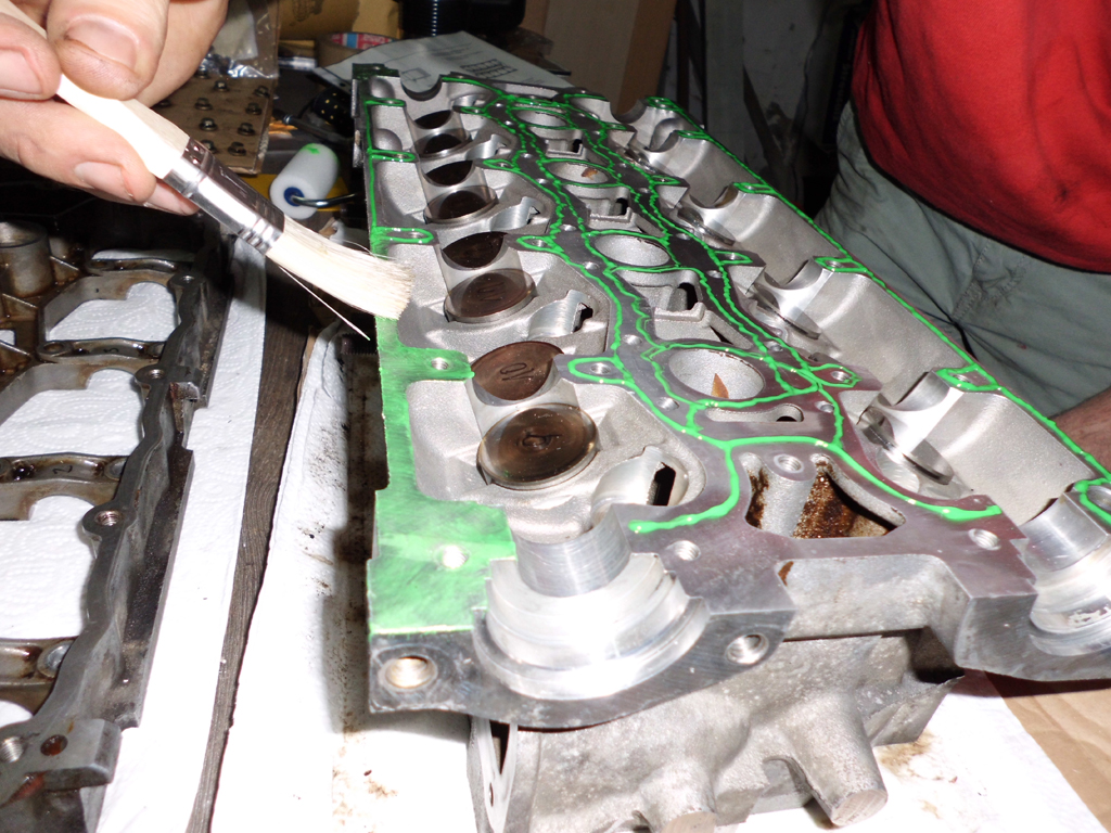 Der Kopf wurde natürlich auf der Unterseite (zum Motorblock hin) geplant. Da hab ich leider kein Foto von Auf der Seite zum Nockenwellenträger wurde er lediglich perfekt gereinigt. Ich habe mich viel informiert und mit dem Stammtisch geredet welche denn in meinem Fall nun die Dichtung ist die wohl am meisten gegen den bisherigen Wasserverlust ankommt. Der Motor hat mittlerweile 207.000km drauf und da die alte nicht hielt (ok Kopf wurde nicht geplant) und selbst der Motorenbauer mir in dem Fall abriet (warum auch immer, er hat selbst schon 3 K Motoren gefahren) habe ich mich zum original entschieden. Die Nockenwellendichtungen werden natürlich reingedrückt, aber das geht ohne Rover Spezialwerkzeug eben nicht gleichmäßig. Daher das selbstgebaute Spezialwerkzeug. Mit einer Rolle hatte ich zuerst die Flächendichtung verteilt, aber nicht auf dem Kopf, sondern auf der Rolle. War wohl die falsche. Da ich noch nen sauberen Pinsel hatte wurde der benutzt und das funktionierte perfekt. Viele Wege fürn nach Stoneleigh und wenn ich jetzt Ruhe mit dem Kühlwasser habe war es mir das echt wert.