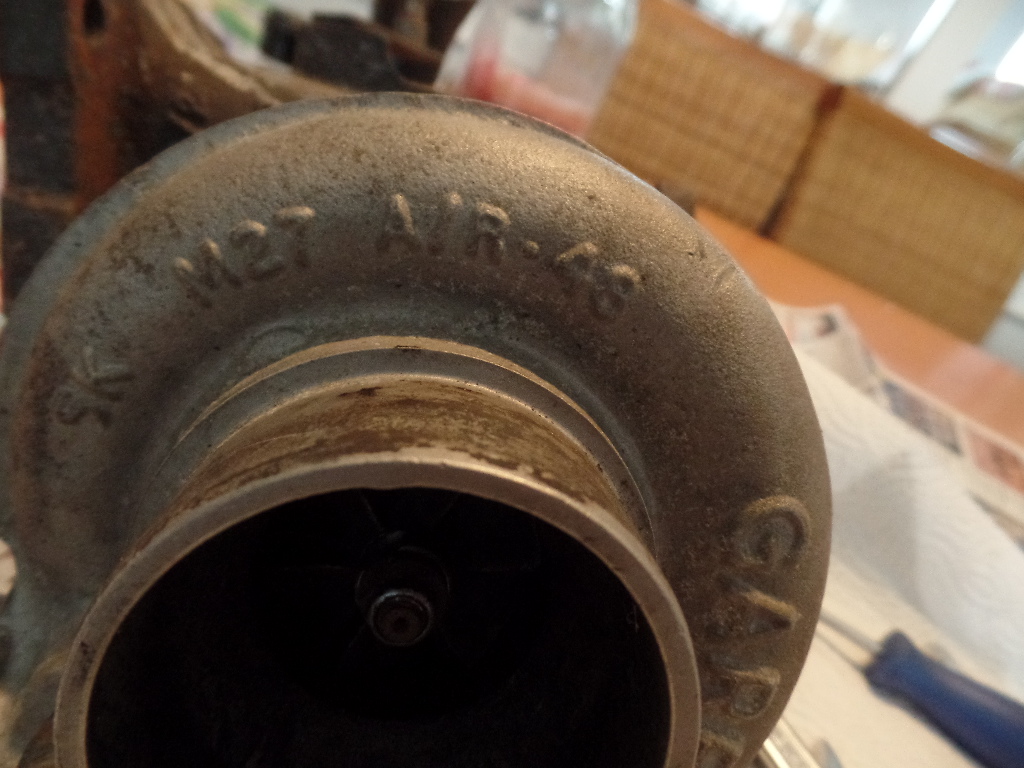Ich hab heute mal versucht, etwas mehr Licht ins Dunkel des eigentlichen Laders zu bringen. Aber so sehr ich mich auch bemüht habe, auf den Tisch, ohne Schraubstock, kriege ich die Schrauben nicht auf, die den Kompressor an der Abgasturbine halten. Eine Neuigkeit ist aber, dass im Kühlwasseranschluss ziemlich viel Öl war. Könnte von ner kaputten Kopfdichtung stammen, könnte aber auch sein, dass da irgendeine Dichtung im Lader selbst nicht dicht hält. Nun, wir werden sehen. Ansonsten sind mir nur ein paar Wasserflecken auf der Unterseite aufgefallen und dass die Welle von der Steuerklappe der Turbine ca. einen Dreiviertel Millimeter Axialspiel hat und ziemlich quietscht, wann man sie dreht. Frage an die Turbokenner hier: ist das normal (weil man wegen der Temperatur da ja nix schmieren kann) oder können wir das Ding wegschmeißen? Hier noch ein paar Fotos vom ausgebauten Turbo: Dateianhang: