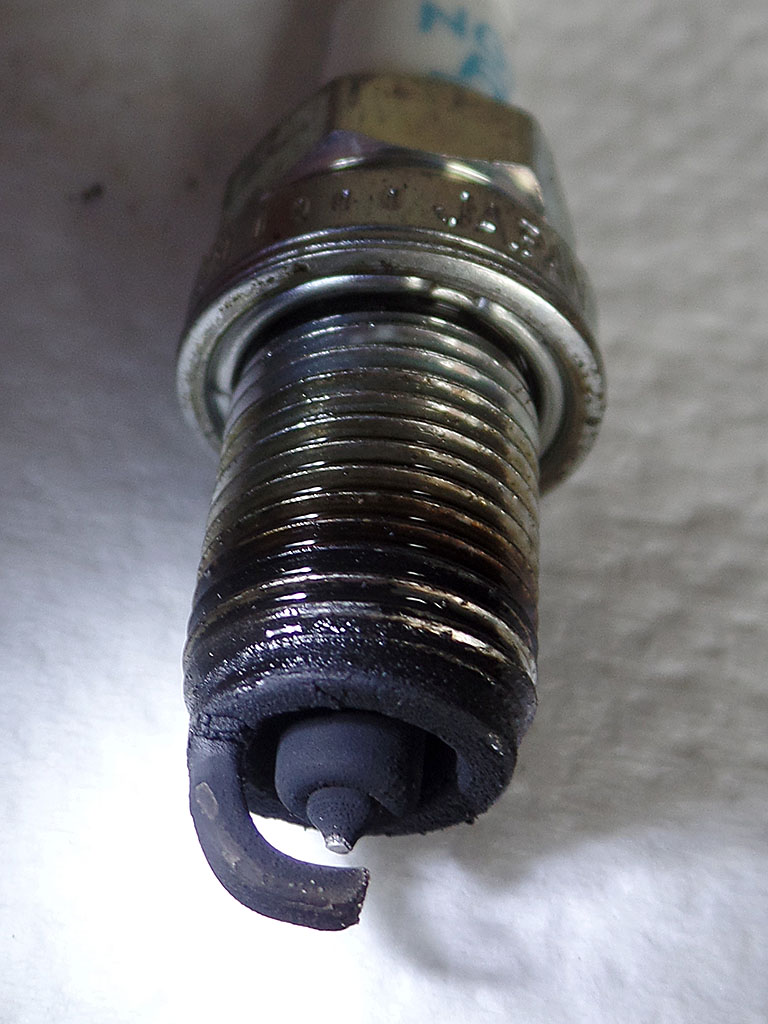 Und weiter im Text. Als ich heute für Caddes Projekt im Tausch die Injektoren, den Benzindruckregler und die fuel rail rausgeholt hatte, dachte ich mir, schau doch erstmal nach den Zündkerzen. Und die sehen allesamt recht grausig aus, wobei Zylinder 1 noch die „schönste“ hat: Dateianhang: