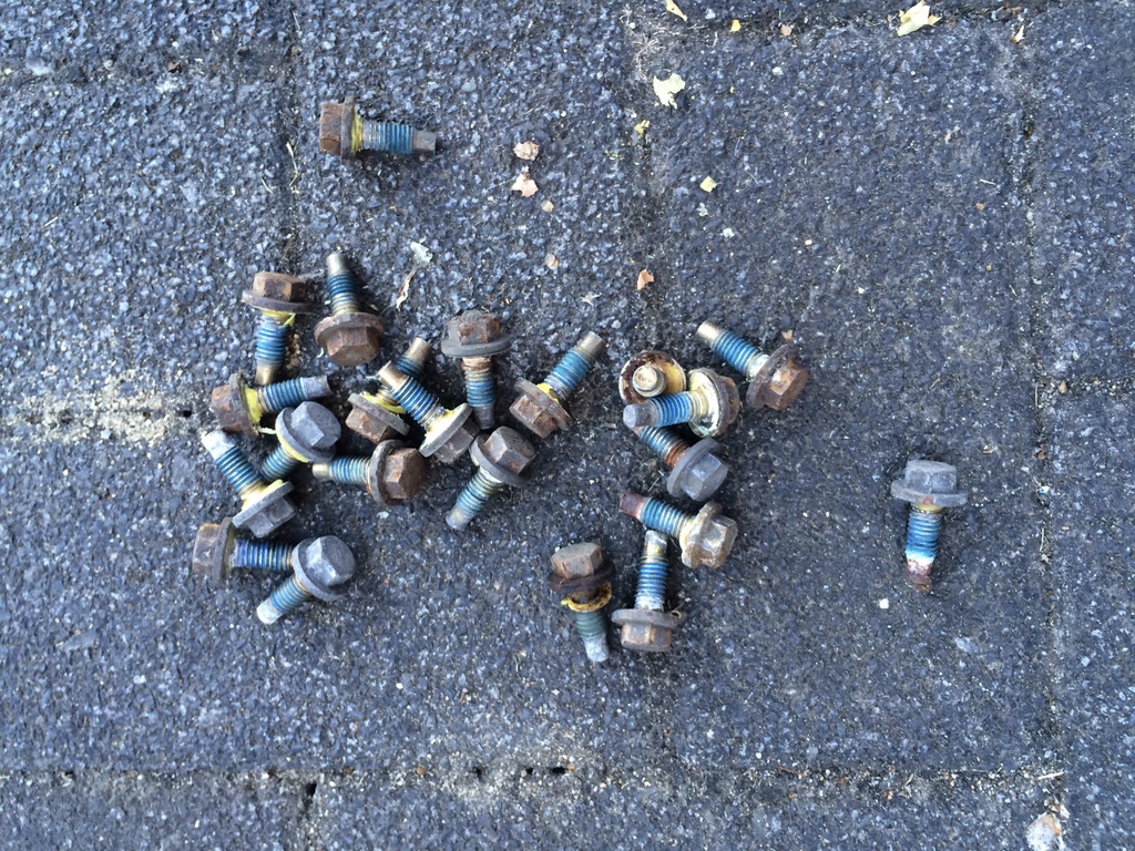 Als nächstes ging’s dann ans Bodenblech, das von insgesamt 22 Schrauben gehalten wird … wahrscheinlich zur Erinnerung, dass die bei der Montage dann mit 22 Nm anzuziehen sind. Ich hatte Glück, dass alle Schrauben noch in gutem Zustand waren, nichts festgerostet, kein WD40 benötigt. So gut sehen die nicht immer aus: