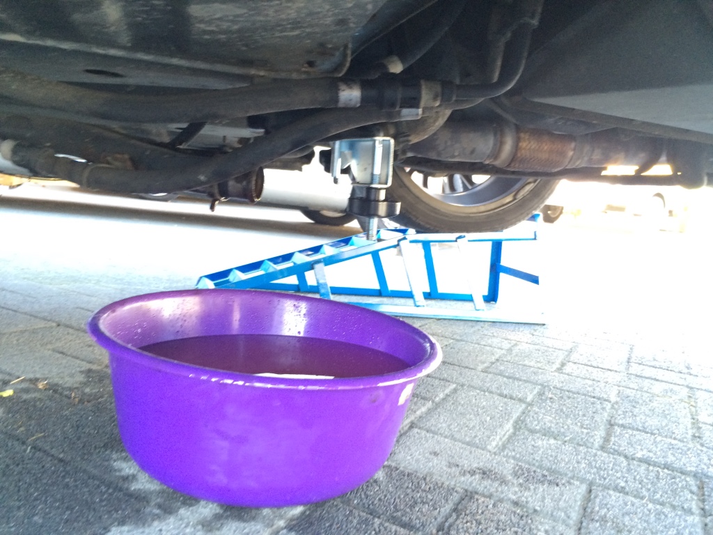 Zunächst hieß es, das Heck auf Auffahrrampen zu bringen, gar nicht so ohne mit dem Automatikgetriebe. Leider passte meine Wampe so immer noch nicht ganz unter den Vorderwagen, also kam dort dann der Wagenheber zum Einsatz