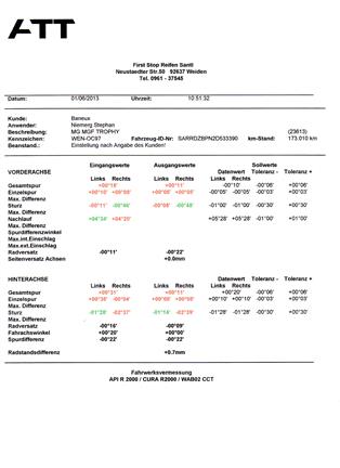 @quattrofver: könntest Du das Messprotokoll mal in einer etwas höheren Auflösung bereitstellen (gerne auch per PM)? Seit ich vorgestern aus der 1. Etage eines Parkhauses gefahren bin und der arme TF vorne etwas aufgesetzt hat (der Winkel zur Waagerechten Fajrbahn war wohl zu groß) zieht er beim Vorwärtsfahren nach rechts (die Neutralstellung des Lenkrads ist jetzt auch leicht nach rechts) und deutlicher beim Rückwärtsfahren nach links. Ich hoffe, das mit einer Spureinstellung beheben zu können, aber mir fehlen die exakten Werte. Oder kann man davon ausgehen. daß eine dies durchführende Werkstatt die für einen MG TF besitzt? Danke!