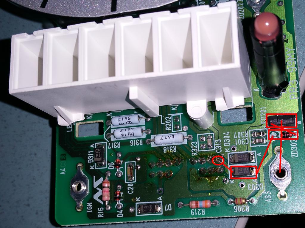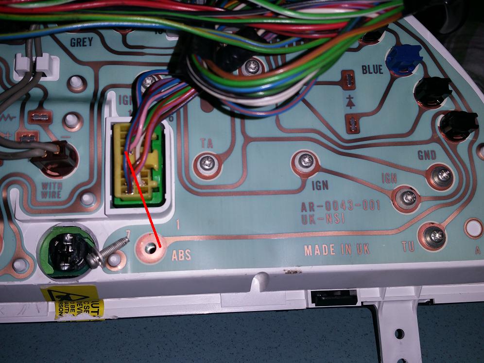 Soweit meine Elektrotechnik-Kenntnisse reichen ist dort ein Widerstand, eine Diode und ein Transistor dazwischen. Also grob vereinfacht eine Invertierungsschaltung. Um den Mk2 Tacho mit einem Mk1 ABS Block zum laufen zu bekommen muss man also nur den Pin (rot/blaues Kabel) aus dem Stecker raus nehmen und an die Stelle anschließen wo sonst die Schraube sitzt. Am besten die Schraube auch gleich draußen lassen das gar kein Kontakt mit der Platine herrscht. Da es sich aber nur um Masse handelt ist das theoretisch auch egal. Dateianhang: