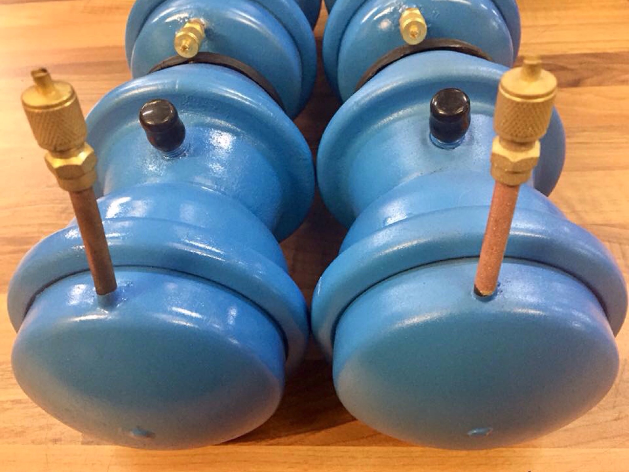 Peter Soons empties the spheres with a vacuum pump to make sure that no fluid and no airbubbles remain, fits the high pressure valves, fils them up with nitrogen to the required pressure and refills them with fluid to the required ride height. It took two days: 1 day to fit the valves, pressurize them and to make sure there are no pressure leaks and one day to refill the fluid and make final checks. A small hole is drilled in the body above the front suspension through which the valves are being mounted. Refilling the nitrogen in the future should be 'a piece of cake'. (There is not al lot to show on a photo, imho)