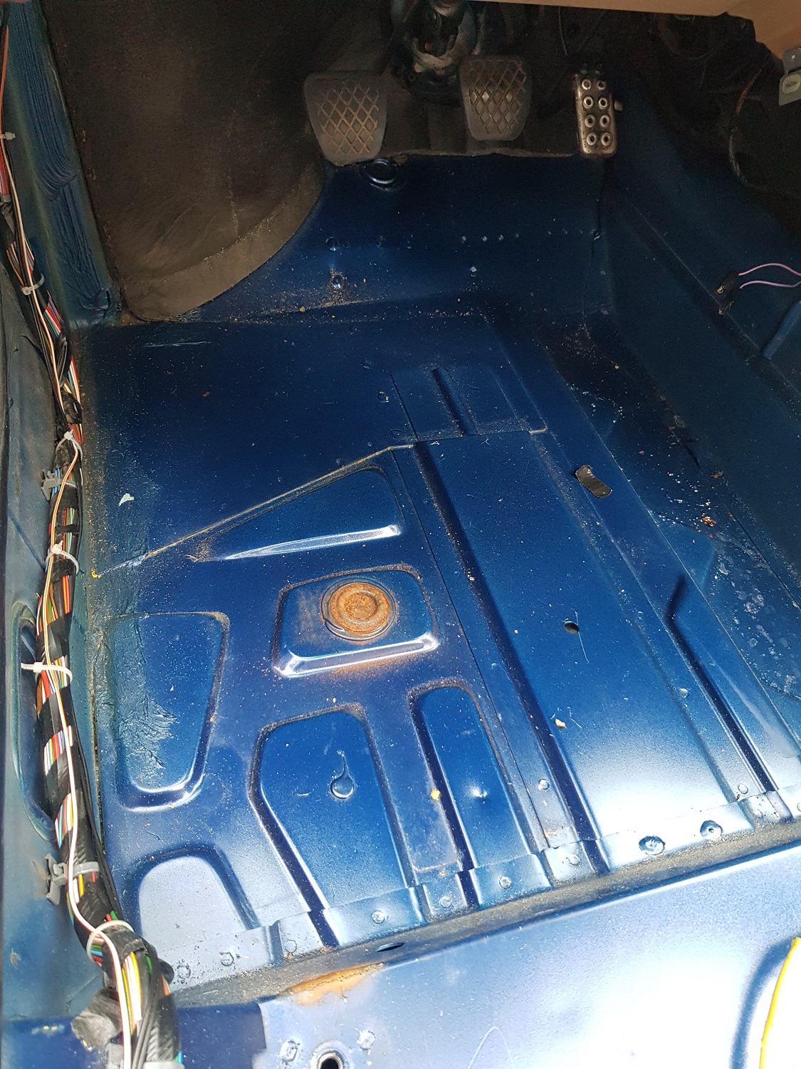 Erkenntnisgewinn 1: Der Originalteppich sowohl an der Rückwand als auch im Fussraum ist nur aufgelegt und mit Kunststoffstopfen fixiert sowie mit dem Klettband an den Außenschwellern. Dateianhang:
