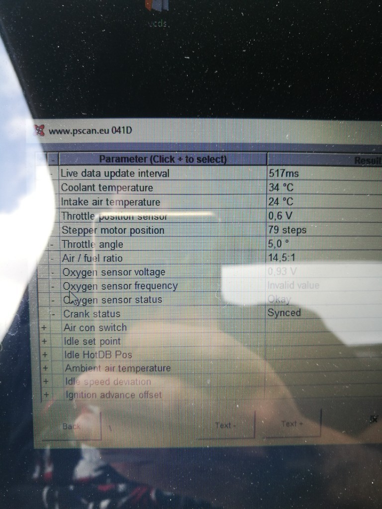 0,6 V und 5° Öffnungswinkel bei der DK ist gut. Zum Stepper kann man bei 34 °C Kühlmitteltemperatur nicht viel sagen. Fahr den mal warm, sodass die über 85 °C ist. Dann Drosselklappen-Reset und nochmal das Pscan dran. Optimaler Wert für den Stepper wären 25 ±5 Schritte. Wenn das mehr ist, ist der DK-Spalt zu eng, wenn es weniger ist, ist der zu weit. Musst du an der kleinen Schraube an der DK einstellen, ggf. zwischendurch noch einen Reset machen, dann wieder prüfen.