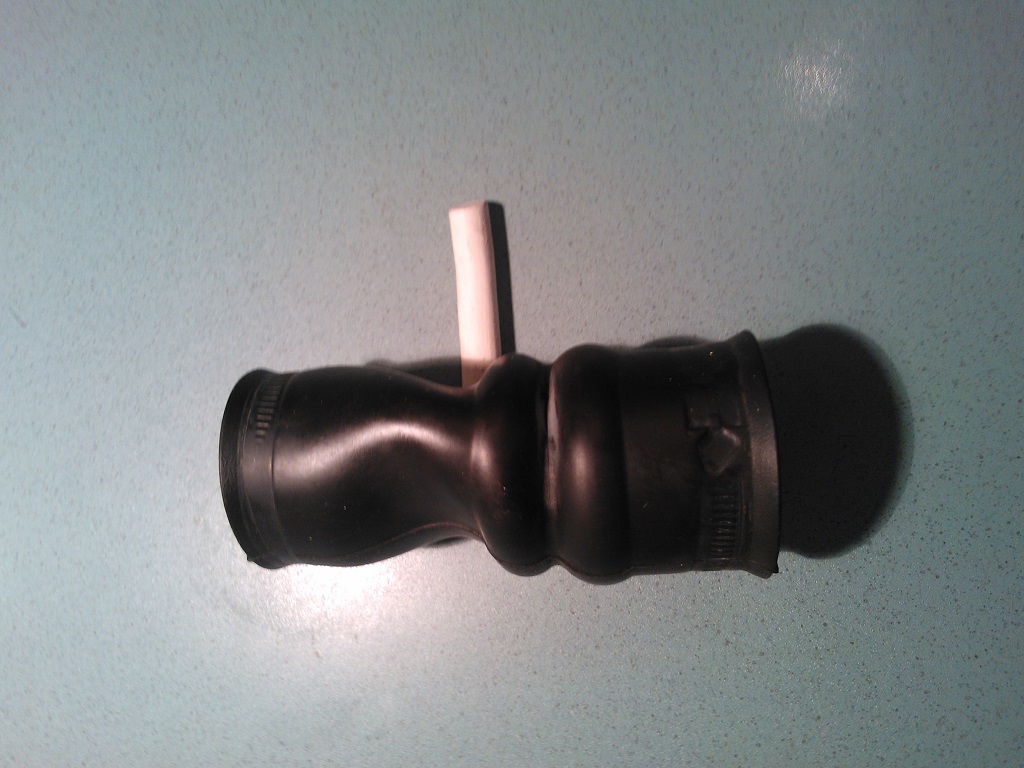 Ganz im Sinne des Threads konnte ich das Problem heute beseitigen. Ich habe das Gummistück gegen ein neues gewechselt. Um das Teil zu wechseln musste ich folgende Teile ausbauen: - Luftfilterkasten Oberteil (mit Schlauch zur Drosselklappe) - Luftfilterkasten Unterteil - Halterung Luftfilterkasten (das Teil wo auch die Aufnahme für den Benzinfilter und die Clips für die Bowdenzüge dran sind) - Tankstutzen muss gelöst aber nicht ausgebaut werden. So sah das alte Teil aus: Dateianhang: