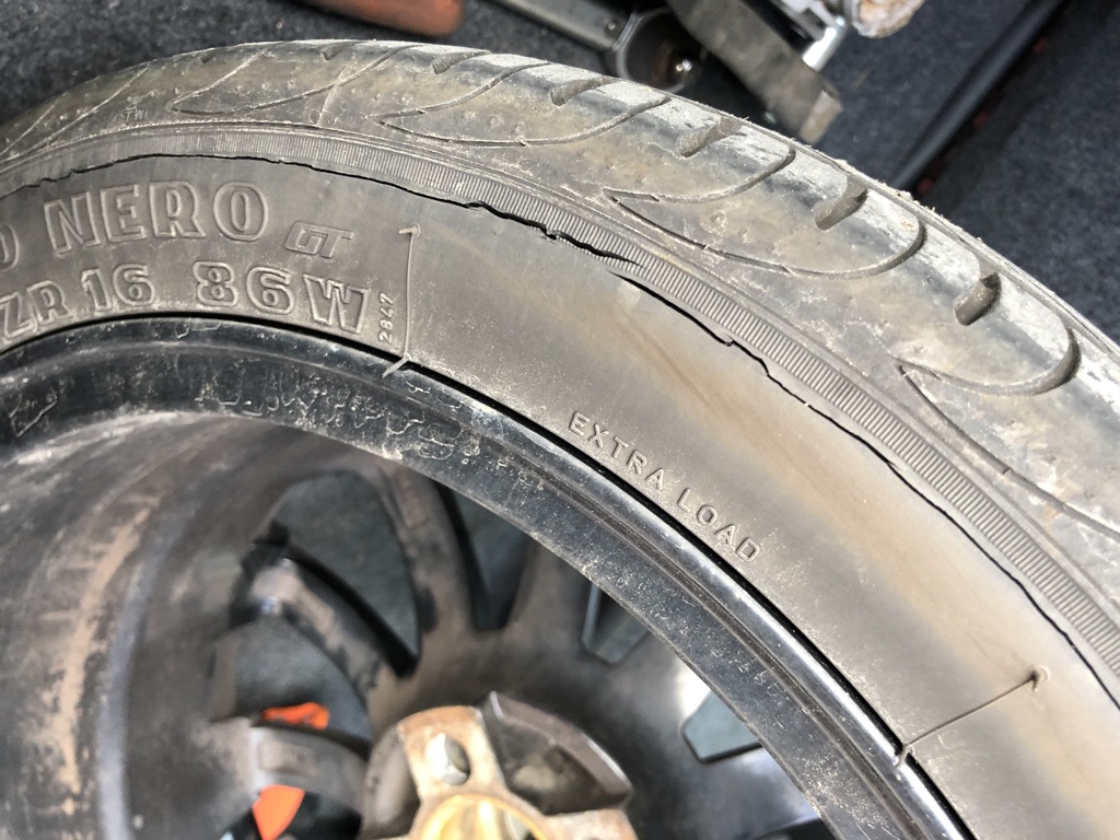 Da hatte ich doch gestern Abend noch ’nen Noteinsatz bei Adrian in Nörvenich. Hinterreifen links platt, bei der Sichtkontrolle fielen dann Risse an der Innenseite der Hinterreifen auf. Pirelli P-Zero Nero GT von 2013, also sechs Jahre alt. War bei der Vorbesitzerin Garagenfahrzeug mit Saisonkennzeichen, wenig Laufleistung.