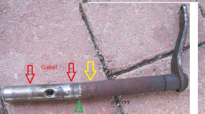 Ja, geil, endlich mal wieder Schrauberfotos ohne Hebebühne. Kannst du dich vielleicht erinnern und auf dem geflexten Teilstücken noch markieren wo ungefähr der ominöse Dichtring sitzt der das Scheissding im Getriebegehäuse abdichtet ? Damit könnte man den Usern endlich mal zeigen das die ganze WD40 und Plusgas Hudelei ein Märchen fürn Heino ist. Falls sonst jemand so'n Foto mit der Position hat, her damit. Hab mal mit Paint spekuliert und den Hebel zusammengelötet, vermutliche Position der Dicht (O-Ring??) ROT markiert und den Punkt wo der Hebel vermutlich aus dem Gehäse kommt mit Gelb markiert. Wer'S besser weiß, bitte Bescheid sagen Dateianhang: