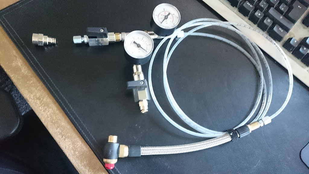 Zum reinen Aufpumpen reicht natürlich auch ein 4 mm Schlauch an den man eine einfache! Ventilverlängerung (wie beschrieben - VG 8x32 auf M8x1) anbringt (siehe Bild - zumindest fast...hier konnte ich eine Ventilverlängerung, die direktin eine Ermetoverbindung endet Nutzen, die ich noch von einer E-Bay-Fettpresse-Pumpe übrig hattealles Schrott außer die gelötete Verlängerung...).