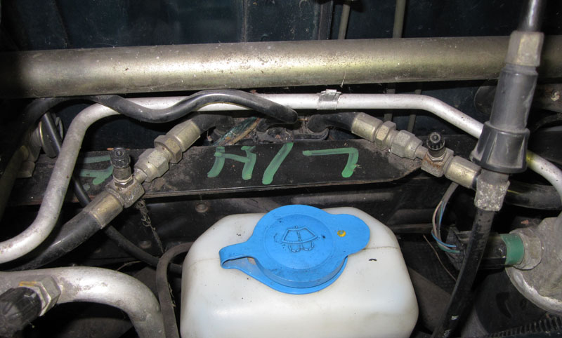 Frage H: Wie ist das beste Vorgehen zur Fehlersuche? Optisch habe ich zumindest keine feuchten Stellen gefunden (siehe angehängte Bilder). 0. mal mit nem Schraubenzieher versuchen den Druck an Ventilen im Kofferrsaum vorn abzulassen, und gucken was da rausspritzt. Ist es was grünes, das nach Spiritus stinkt, ist es schon mal gut. 1. mal mit den drei mittleren Fingern den Staubschutz der Einheiten nach innen drücken, obs dann feucht wird. Da ist ein Lüftungslöchlein im Staubschutz wo's rauskommen könnte. 2. Falls OK, dann halt mal aufpumpen mit mindestens 20 Bar, kann auch Luft sein, aber kein Öl oder so'n Schei** 3. Falls nichts zu finden ist, dann die einzelnen einheiten abdrücken (Gibt's n Einzelanschluss dafür) 4. Da in diesem Fall sowieso 3 der 4 Gelenkbolzen im Arsch sind, kann man sich einiges sparen, die Dinger müssen eh alle raus