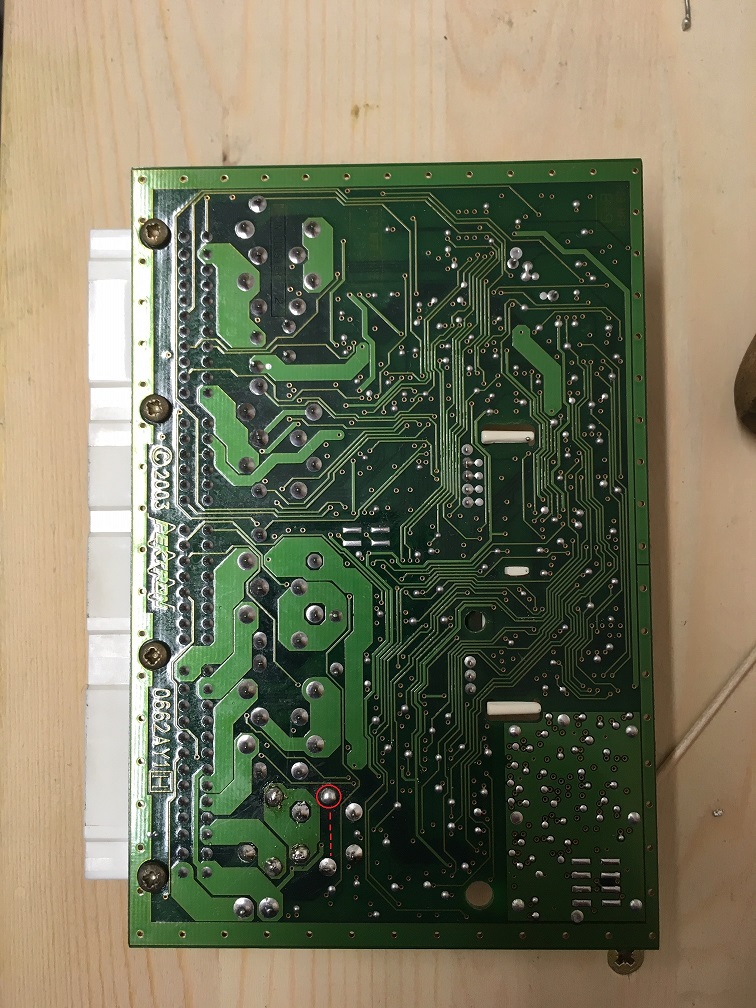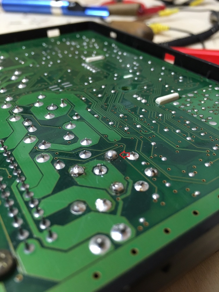 Ich habe gestern mal die SCU ausgebaut und durch ein neues Relais ersetzt. Leider hat es das Problem bezüglich "Dauernder Hupe" nicht gelöst! Auf der SCU habe ich das ganz Linke Relais ersetzt. Und es war nicht so leicht, das auszulöten wegen dem alten Lot. Zu allem übel hat sich auch noch ein Lötpin von der Platine gelöst. Ich konnte den zwar wieder an der Platine befestigen mit Kleber, bin mir aber nicht sicher, ob ich dadurch nicht doch die SCU geschrottet habe. Ich habe das mal farblich markiert. Kennt sich jemand aus mit der SCU. Kann ich evtl. eine Brücke ziehen mit einem Kabel zu dem daneben gelegenen Pin oder an der Platine an der Stelle etwas kratzen und versuchen, etwas Lot anzubringen? Ist mehr als ärgerlich. Vielleicht kennt jemand auch jemanden, der das reparieren kann oder einen Tipp hat. Da es eine Layer 4 Platine ist, ist die Frage, ob meine Überlegungen bezüglich des einen Lötpin reichen? Ich habe den betroffenen Lötpin mal mit einem Kreis markiert und eine gestrichelte Linie gezogen zu einem Pin, wo ich evtl eine Brücke ziehen könnte mit einem Kabel?