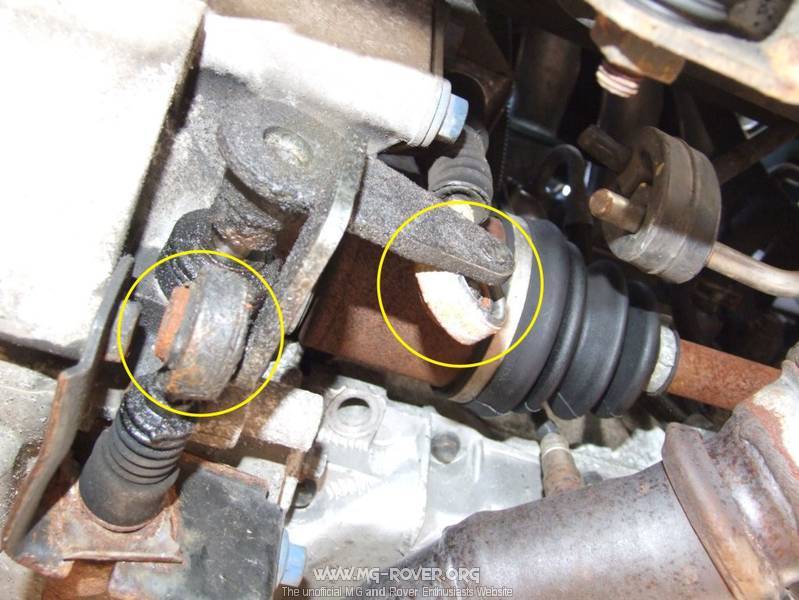 die "Gummiaugen" sind intakt - die vordere Schraube des Schaltrahmens in dem der Schalthebel aufgehängt ist, hatte sich gelockert. Die daraus resultierenden 2-3 mm Spiel haben die Schaltprobleme verursacht.