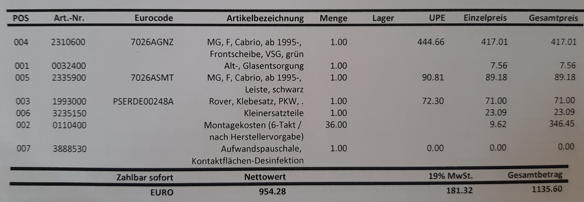 Ich war heute in der richtigen Filiale in Chemnitz und habe den Austausch der Frontscheibe eingeleitet. Die Scheibe soll nächste oder übernächste Woche kommen. Bin gespannt was es für eine Scheibe wird. Hier mal die Rechnung mit den einzelnen Posten: Dateianhang: