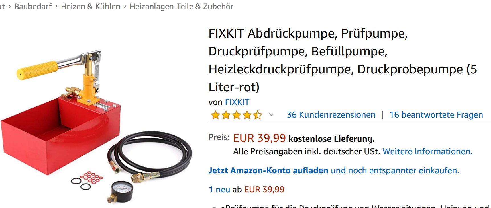 Klar. Die von mir immer gerne empfohlene Pumpe findet sich wohl nicht mehr auf EBay - dafür nun bei Amazon, dem alten Kapitalisten: FIXKIT Abdrückpumpe, Prüfpumpe, Druckprüfpumpe, Befüllpumpe, Heizleckdruckprüfpumpe, Druckprobepumpe (5 Liter-rot)Dateianhang: