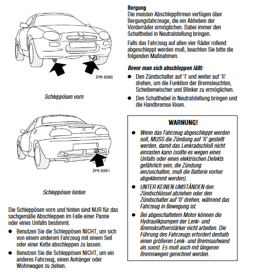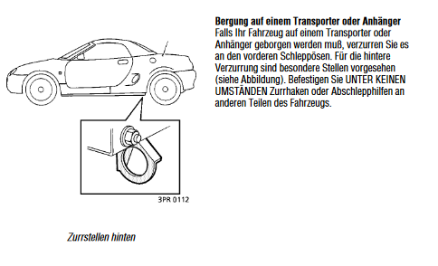 Unten die Ösen sind Verzurrösen, nur zur Sicherunger bei der Überfahrt über den Ärmelkanal. Keine Abschleppösen, dabei können die abreisen. Hinten an der Stoßstange, rechts in Fahrtrichtung, neben dem Auspuff, ist eine Öse, damit kannst du ihn rückwärts hoch ziehen.