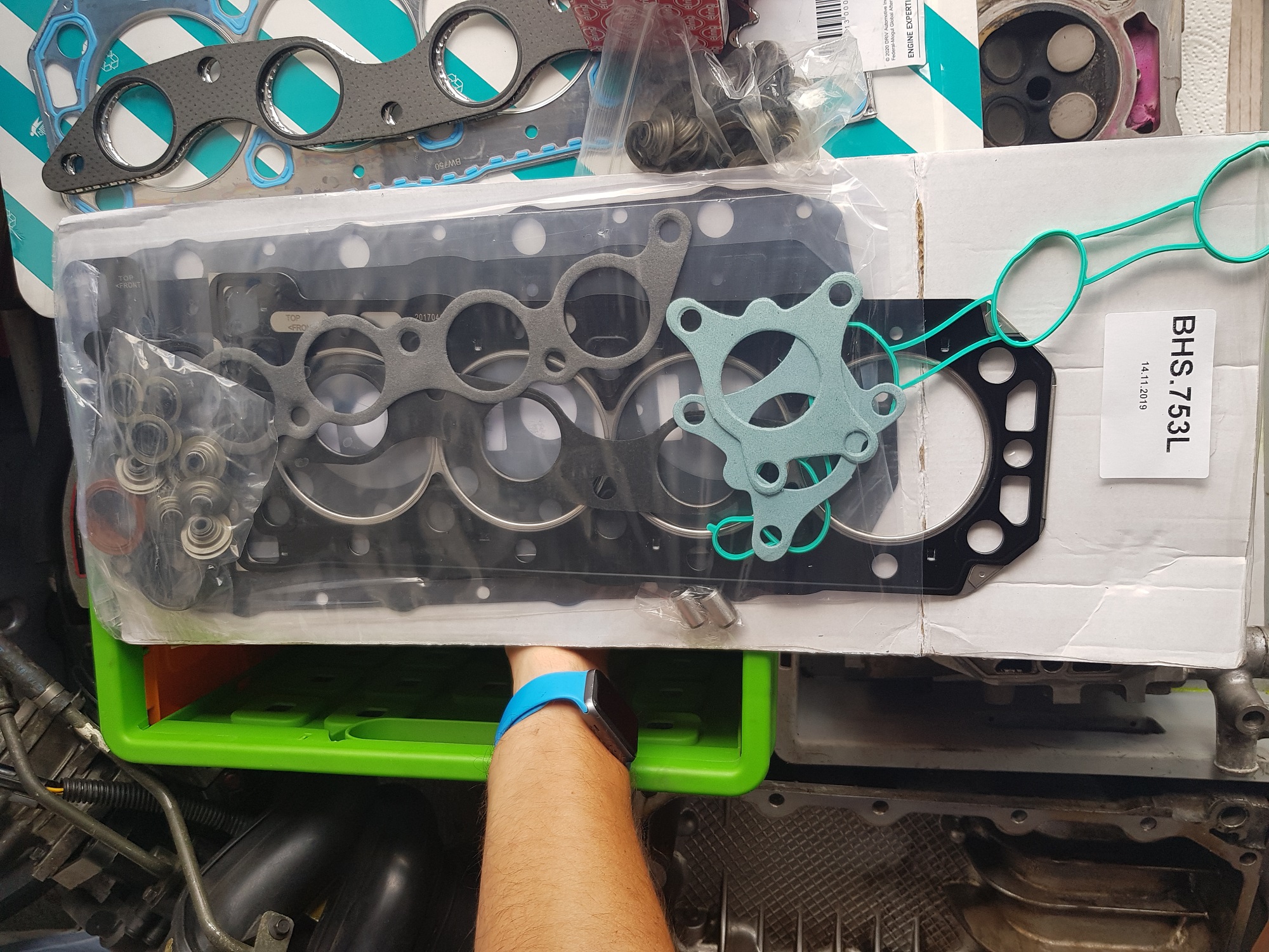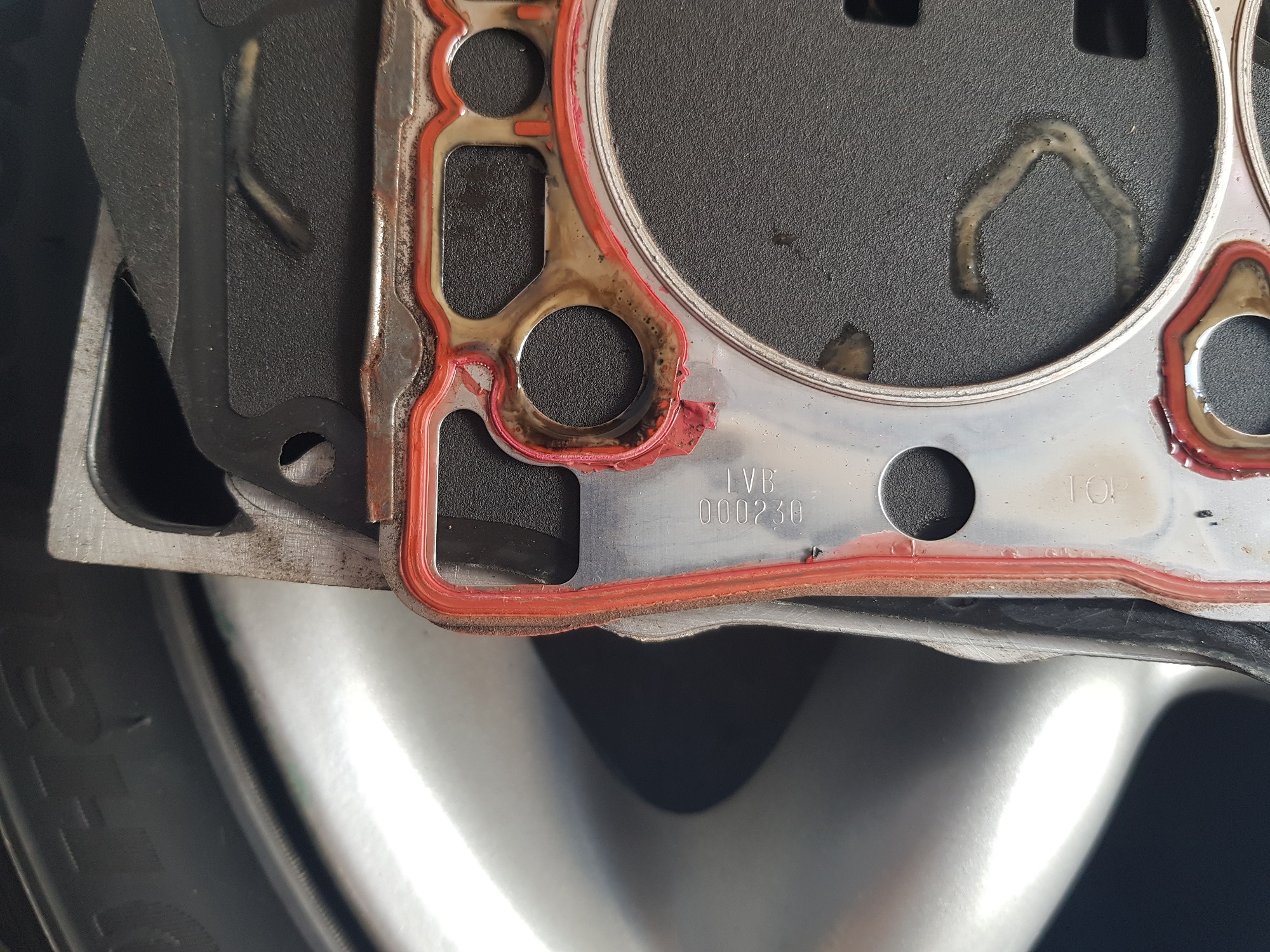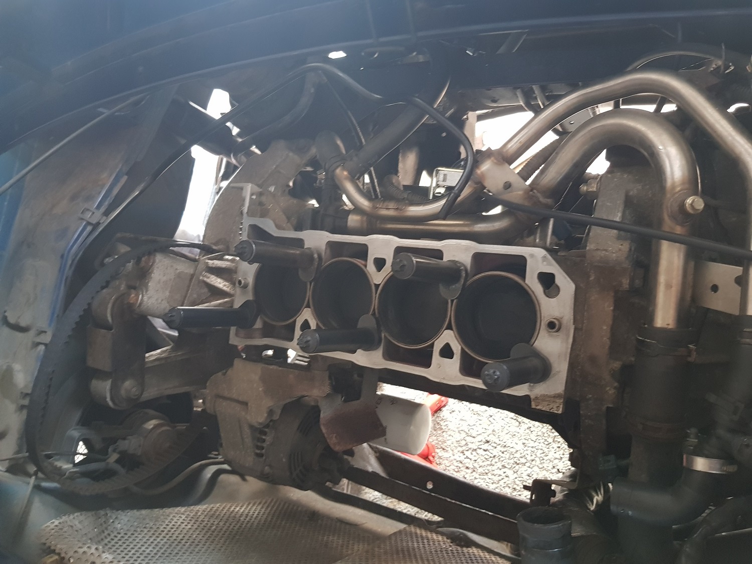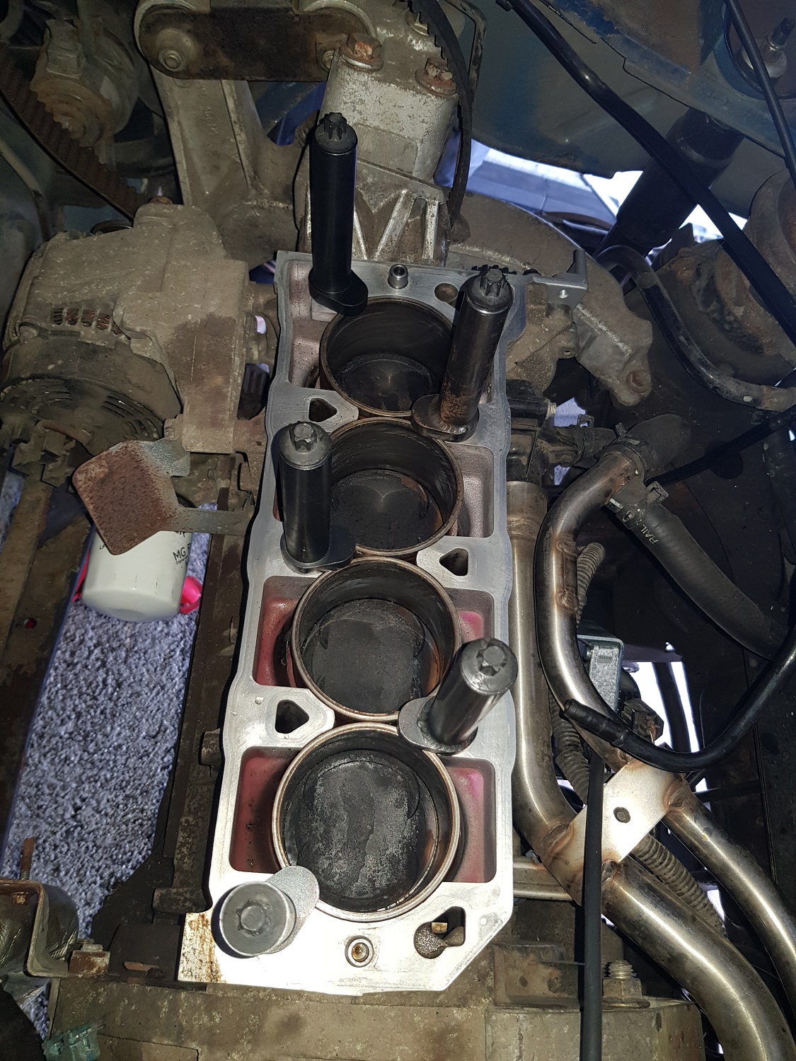 Diagnose:- Ich fahre zu wenig (die Ursache allen übels?) - ein Stehbolzen Abgaskrümmer war weg (huh?) - beide Kühlwassertemperatursensoren sahen so aus, als hätte es Wasser durchgedrückt - Edelstahl-Cat-Safer Nuts sind auch nicht das Wahre- 1 von 6 gerissen - irgendwer hat da Bosch Zündkerzen reingeschraubt - Ich habe sowohl Ölablassschraube als auch Ölfilter viel zu fest angezogen.... - 9 Liter Wasser / Öl-Gemisch kamen aus der Ölablassschraube => Zylinderkopfdichtung war eine original Rover LVB 00230 (womöglich sogar die erste?) => Zylinderkopfdichtung hat an der "klassischen" Stelle - "Church Doors" versagt, einmal ursächlich für die braune Flüssigkeit, ein zweites mal kurz davor (Versatz Dichtmasse) => Zylinderkopf i.O. (war klar, war ja nicht überhitzt) => Laufbuchsenüberstand ist ok, Buchsen scheinen fest, wird sich die nächsten 2x Wochen zeigen => Haarlinial zeigt, dass der Block in der Mitte etwas abgesackt ist (eher mehr Ansaugseite als Abgasseite) => Motor hatte schon "Steel Dowls" Wir haben jetzt vereinbart das folgendes gemacht wird:- Shirley BHS.753L Dichtungssatz (MLS Dichtung) mit 10,9er Schrauben und verstärkter Ölschiene => die ein oder andere unwesentliche Dichtung aus dem Satz wird wohl durch bessere getauscht (fragt mich nicht welche) - Zylinderkopf wird geplant, Ventilschaftdichtung neu, Ventile einschleifen (Motorenbauer) - Nockenwellensimmerringe neu (4x) - Wasserpumpe, Zahn- und Keilriemen neu - Öl + Filter + Kühlwasser neu - Flammrohrwinkel GEX13002 wird verbaut sowie neue Auspuffdichtungen (3x) - CowaCarParts Mk1 "Originalkat" wird verbaut - NGK Zündspule mit neuer Leitung zur Verteilerkappe + original Rover Zündkerzen - MG TF Verstärkungsstreben hinten verbaut - 2x neue Kühlmitteltemperatursensoren - 1x neue Lambdasonde ( nur auf Verdacht, kommt man niemals mehr ran) - MGMania Keilriemenspanner - Luftfilter Paar Bilder: Dateianhang: