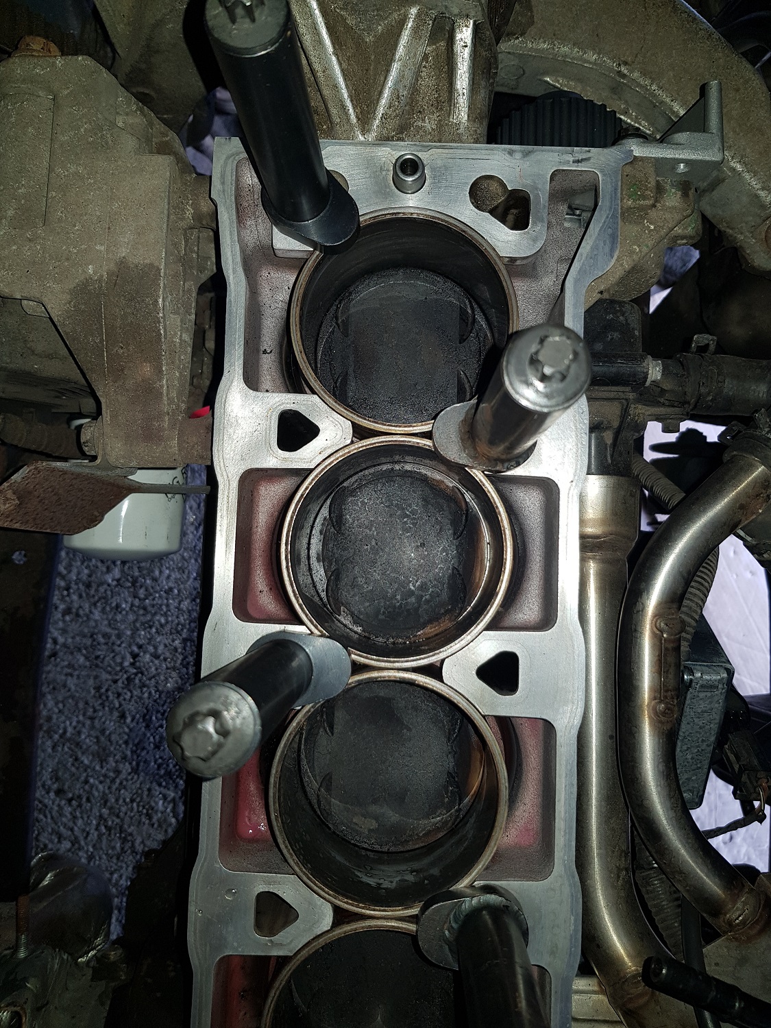 - die ganze Zeit war die Kühlwassertemperatur normal ein Strich unter Mitte, er war nie überhitzt - der Ausgleichsbehälter war nie leer, es war immer ein Rest Kühlwasser im unteren Bereich / der untere Auslauf hat keine Luft gezogen - Öltemperatur war nie überhitzt - zum Schluss die letzten Meter in der Garage abstellen lief er arg unrund in Leerlauf
