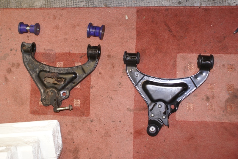 Jetzt aber mal wieder ein Problem: Der neue Querlenker hat andere Gummis als der auf der rechten Seite. Da ich wieder die Powerflex einbauen will, müssen die im neuen Querlenker raus. Ist aber alles andere als einfach. Hab gesägt, gebohrt, gefeuert, geschraubstockt... Hilft alles nix! Jemand ne Idee wie ich diese Dinger rausbekomme? Da die Gummis schon teils abgeschnitten sind gibt es kein zurück mehr. Hoffe das die Maße des neuen Querlenkers mit den Originalen übereinstimmen.