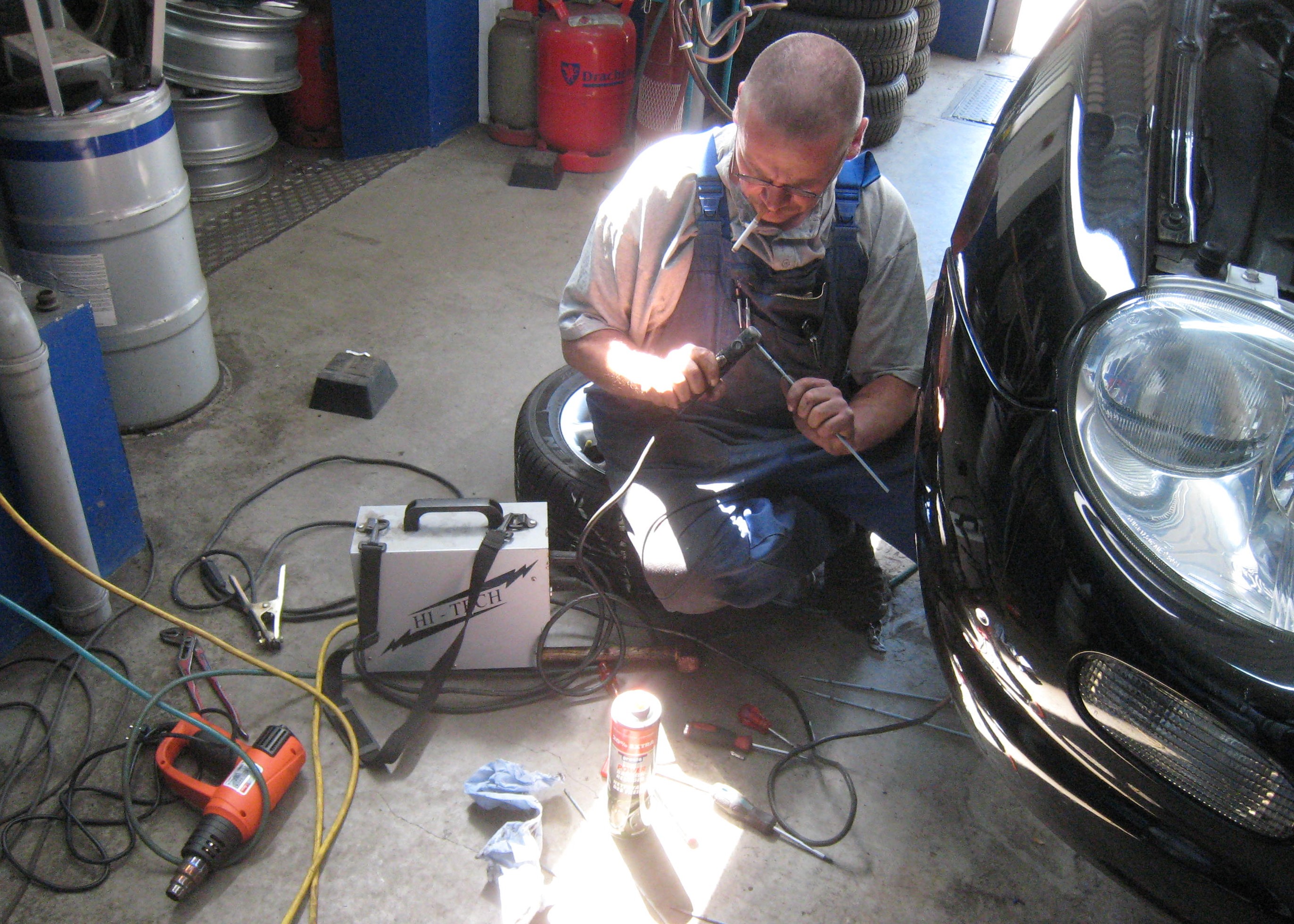 Nr 3 angegangen. 140 Ampere E-Schweissgerät angeklemmt und versucht eine Elektrode als Zugvorrichtung anzuheften.