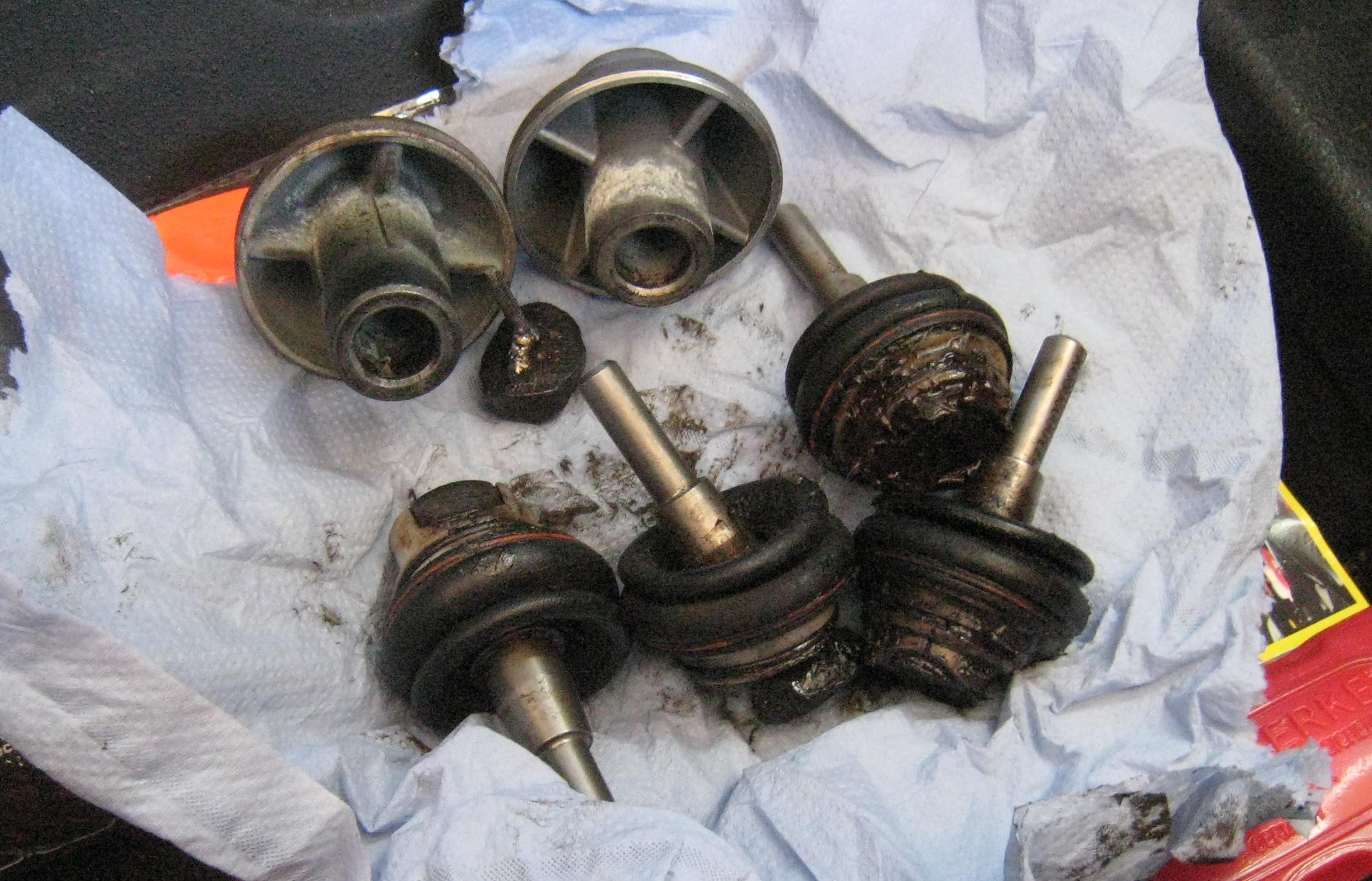 Der Plastikhalter war bei dreien ausgehoben und die Druckplatte bei zwei von denen samt Plastikteil im Oberlenker schier unlösbar festgerostet.