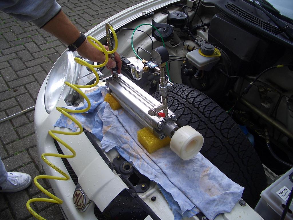 Also, eigentlich wollte ich schon immer eine selber bauen. Habe mir dann aber aus UK die umgebaute Fettpressenpumpe zugelegt. Die Erkenntnis war, die Pumpe ist unbrauchbar aber einige Komponenten sind gut. Die Uk Pumpe taugt aus 2 Gründen nichts. Punkt 1: Die Führung in der der Kolben läuft ist sehr schlecht entgratet, sprich nach spätestens 5 mal pumpen sind die O Ringe im Kolben hinüber, ich habe versucht dort nachzuarbeiten aber ohne Erfolg. Der 2te Punkt ist der das das Rückschlagventil in der Kreuzung aus einer Feder und einer Kugel besteht. Grundätzlich nicht verkehrt, jedoch wenn der Druck zu hoch ist, fällt die Kugel in die Kreuzung und die Pumpe wird zum Springbrunnen. Möglich das ich eine Montagspumpe erwischt habe, aber leider Tatsache. Jetzt haben mein Nachbar und ich bei etlichen Bierchen folgende Pumpe auf die Beine gestellt. Sie arbeitet mit Luftdruck aus einem Industriekompressor mit ca. 30 bar und Druckminderer, so das der Druck in der Pumpe immer nur ein wenig höher ist wie im System. Das Fluid wird in der viereckigen Zylinder gefüllt und dann mit Luftdruck ins Auto. Dies geht nur mit einem Kompressor der die Leistung bringt, ein normaler "Haushaltskompressor" bringt ca. 8 Bar mit Booster kurzfristig 16 Bar, deswegen braucht man da einen mit richtig Bums. Über kurz oder lang werden wir wieder auf eine Handpumpe umbauen, da es etwas unpraktikabel ist ständig einen Industriekompressor mit rumzuschleppen um einen F aufzupumpen.