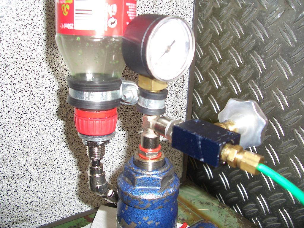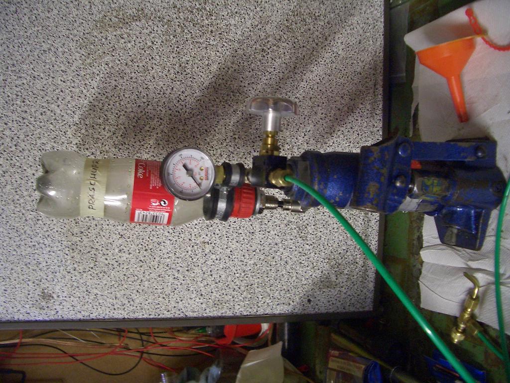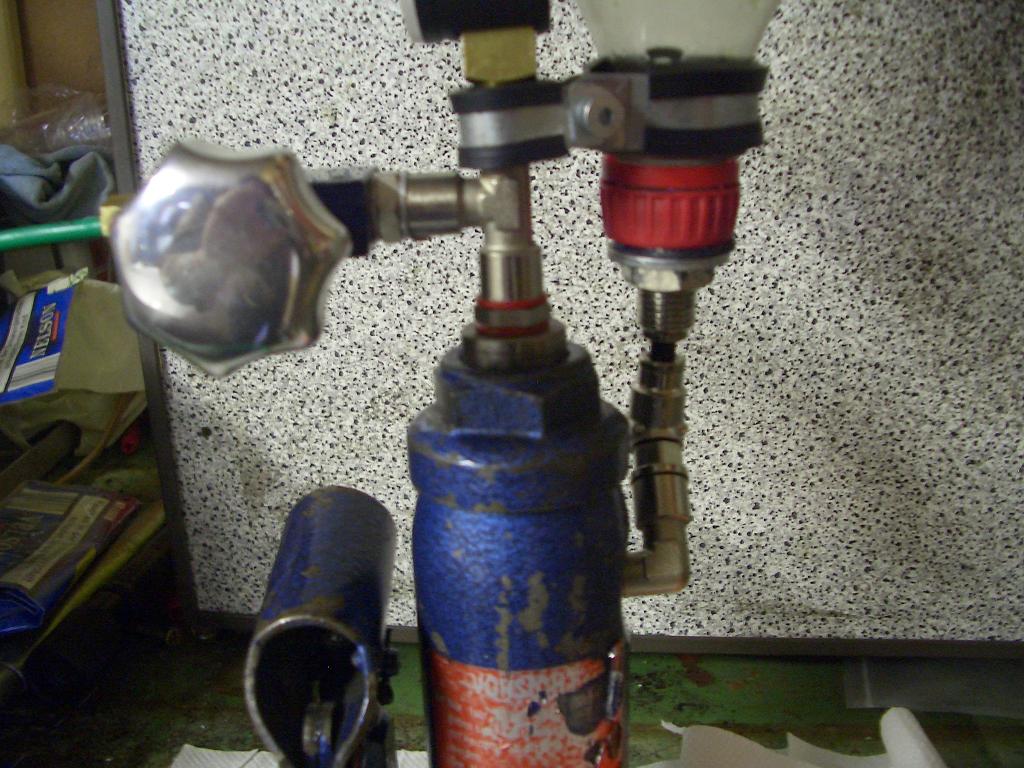 So, wir waren wieder fleißig in Garage und Keller. Nach dem "Hochdruckmonster" mußte was praktikabeleres her. Also, die Pumpe wieder komplett zerlegt und überlegt was wir nehmen, von Fettpressen hatte ich die Nase voll. So mußte dann ein normaler 2 to Hydraulikwagenheber aus dem Fundus dran glauben. Vorteilhaft war, daß dieser zum schrauben war. Öl raus und erstmal zerlegt, der Kolben ließ sich nur mit roher (bzw. heißer) Gewalt überreden sein bisheriges Tätigkeitsfeld zu verlassen. Dann den Kolben oben abgeflext, sauber gefeilt und ein Loch rein gebohrt (dabei waren dann 2 Bohrer hin), anschließend ein 1/8 Gewinde reingeschnitten. Anschließend den Kolben in die Laufbuchse eingeschweißt bzw. nur gepunktet, da war dann der Kardinalfehler. Nun den ganzen Druckkrempel verbaut, in die Öleinfüllöffnung ein Gewinde geschnitten und mittels einer holländischen 250 ml Cola Flasche ein Reservoir drangefummelt. Ab zum MG, angeschlossen und es pumpte nix. Es ging nichts rein. Abgebaut, wieder in den Keller an die Werkbank, ein paar Kölsch und leider auch ein paar Obstler auf den Frust und mit der Fehlersuche begonnen. Fehler gefunden, der Kolben muß logischerweise dicht geschweißt werden, so das das Fluid nur durch die Mitte des Kolbens rausgedrückt wird, ab aufs Fahrrad zum Kumpel Erwin geradelt und er hat den Kolben dann Schutzgas dicht geschweißt, ich glaube da haben wir dann noch auf den Erfolg noch ein Kölsch schnell auf die Faust genommen. Zuhause wieder angekommen, alles gereinigt und Endmontage. Wieder zum MG und und und .... natürlich ging nichts. Fehlersuche, aha Rückschlag ventil verkehrt rum eingebaut. Doch dann das gute Ende, das Ding pumpt wie hulle. Es geht sowas von gut, dafür habe ich dann die Kopfschmerzen gerne in Kauf genommen.