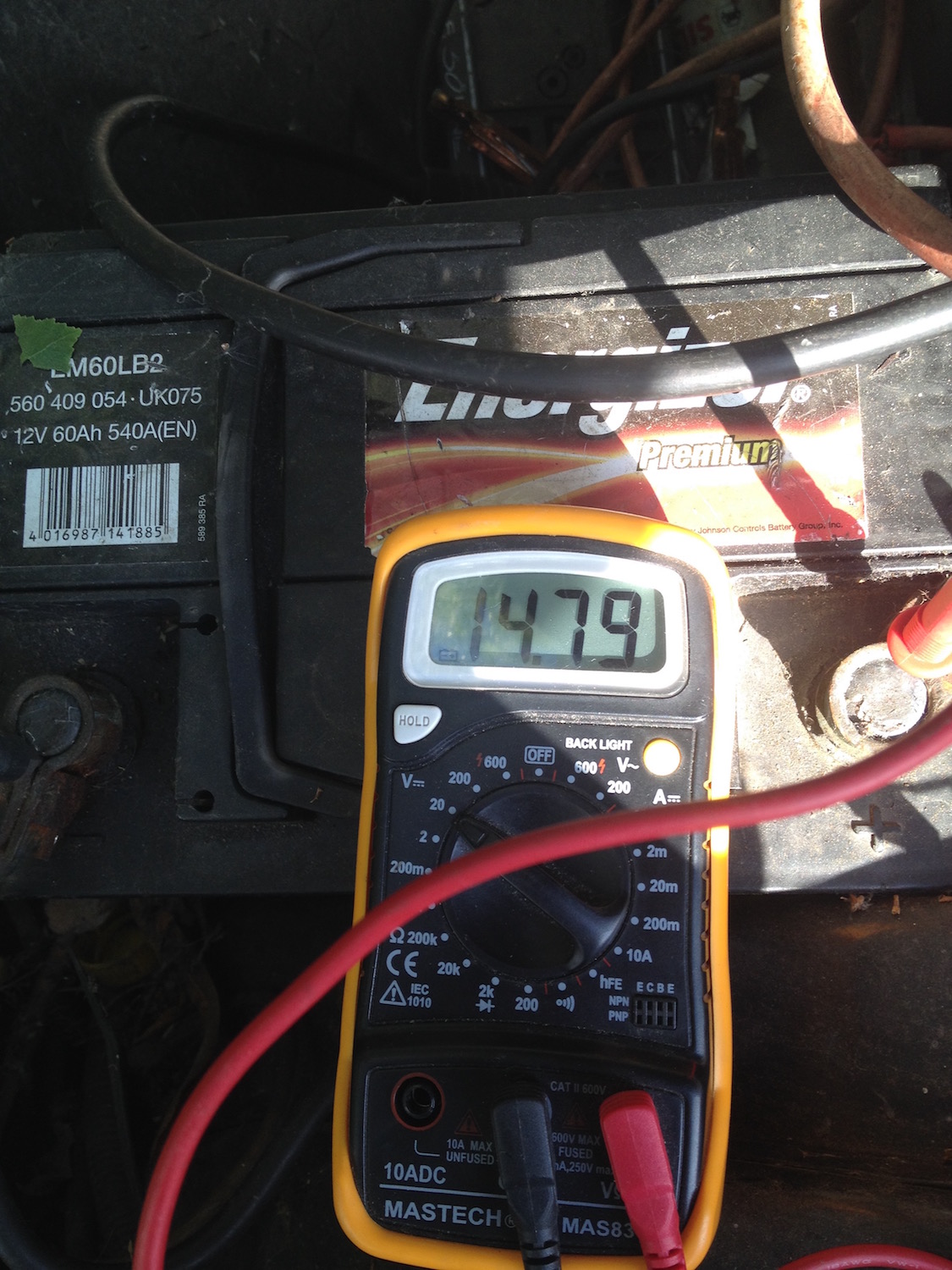 Hast Du mal eine anständige Batterie genommen, eine die auch funktioniert?. Der Rote startet doch oder?, dann nimm die Batterie doch mal oder überbrücke mit dem zum Turbo. Ich vermute mal das die Batterie im Turbo fritte ist und bei Last zu stark einbricht. Die 14,7 V kann ich mir beim besten Wille nicht vorstellen oder war da noch das Ladegerät angeklemmt?.
