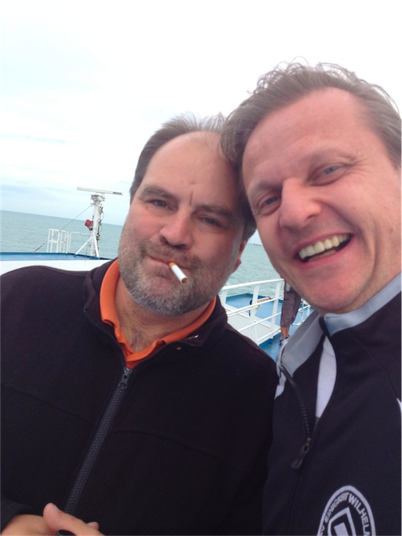 Ja, Michael , Recht hast Du ! Danke nochmal an Markus für seinen Audi und Mykel für die Organisation, Steffi für die alternative Bordverpflegung ( Kekse !  ) und Beistand in allen Lebenslagen ! Ich denk da war ein Bombenteam unterwegs. Wir haben drüben ordentlich Eindruck hinterlassen, denk ich mir .... Oder für Verwirrung gesorgt ...  Hier nochmals die Probanden : Sprachgenie und Fährtenleser Mykel mit dem Fischkopp/Geheimagent/Cartoonist/wieauchimmerdenkteuchwasaus : Dateianhang: