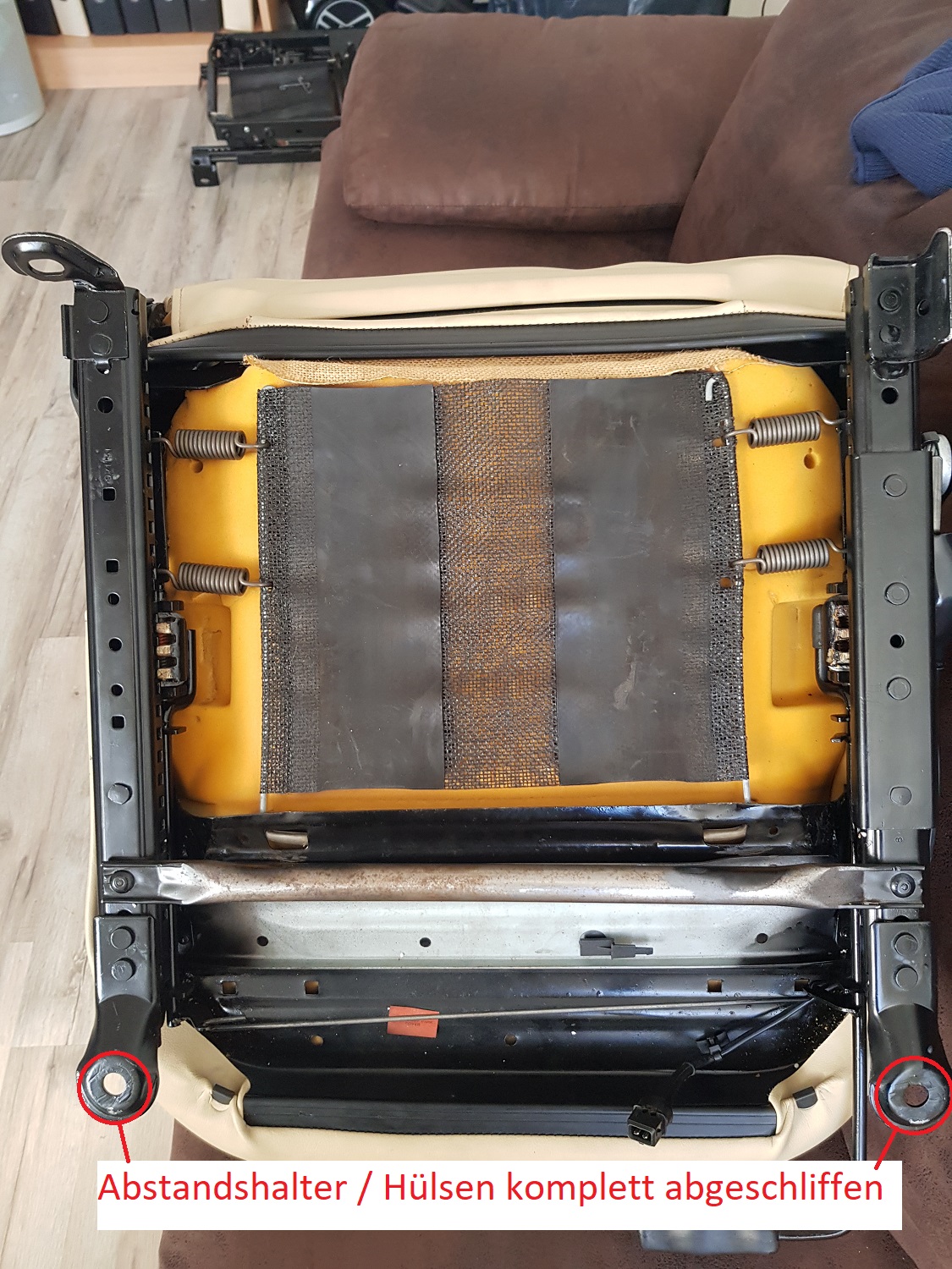 Also in der Sitzposition irgendwo in der Mitte wo die meisten von uns sItzen werden, ist der Arsch mehr oder weniger über dieser Verstärkung, auf dem der Sitz geschraubt wird. Die Verstärking innen ist auch dafür da, die Schrauben vom Unterbodenverstärkungsblech aufzunehmen. Schon ohne Federn sondern mit den Serienklammern hat des Netz auf dem Teppich geschliffen und der Sitz war kaum zu verschieben unter meinem Gewicht.