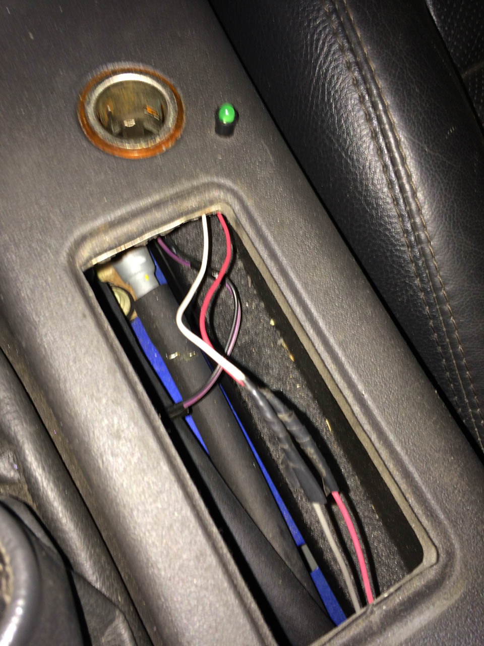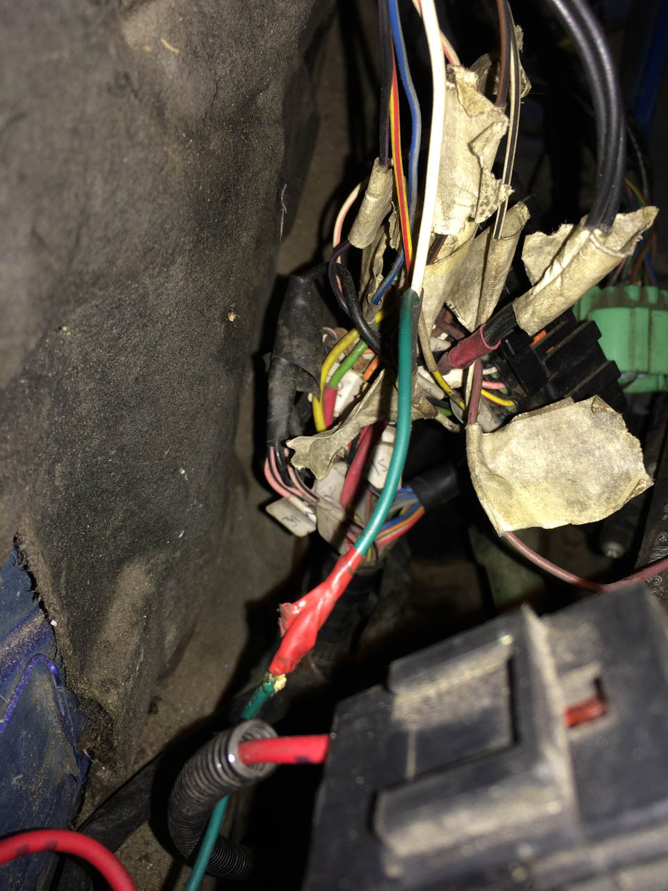 Ist nun aber alles sauber entfernt und die Funktionsweise der Kühlmittelpumpe vom LLK ist nun auch klar. Die wird über ein Relais betrieben, das Saft vom Anlasser über eine Sicherung zur Pumpe schaltet, gesteuert wird das Relais vom selben Kontakt wie die Benzinpumpe. Die läuft also dauernd. Hier mal ein Foto von den Kabeln: Dateianhang: