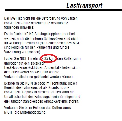 Peter, ganz im Gegenteil. Klar darf ein MGF 35 Kg haben  Nur wollt ich die TF Fahrer nicht gleich wieder in tiefe Depressionen stürzen ... und rummobben Drum hab ich die TF Gebrauchsanleitung letzter Stand da oben gescannt ... TF nur 20kg