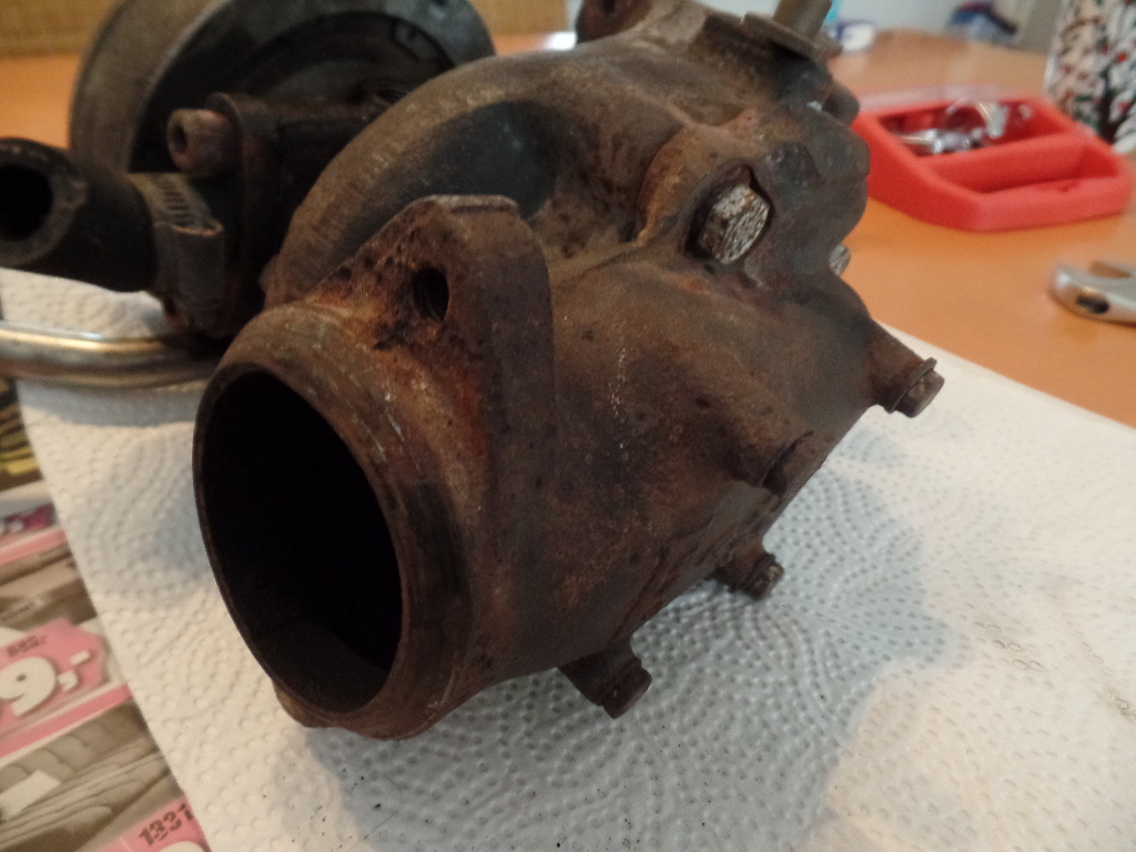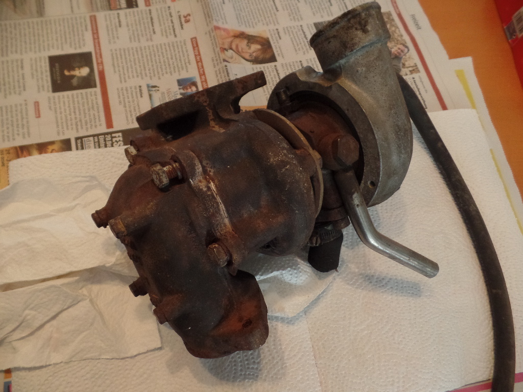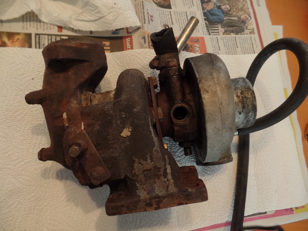 Ich hab heute mal versucht, etwas mehr Licht ins Dunkel des eigentlichen Laders zu bringen. Aber so sehr ich mich auch bemüht habe, auf den Tisch, ohne Schraubstock, kriege ich die Schrauben nicht auf, die den Kompressor an der Abgasturbine halten. Eine Neuigkeit ist aber, dass im Kühlwasseranschluss ziemlich viel Öl war. Könnte von ner kaputten Kopfdichtung stammen, könnte aber auch sein, dass da irgendeine Dichtung im Lader selbst nicht dicht hält. Nun, wir werden sehen. Ansonsten sind mir nur ein paar Wasserflecken auf der Unterseite aufgefallen und dass die Welle von der Steuerklappe der Turbine ca. einen Dreiviertel Millimeter Axialspiel hat und ziemlich quietscht, wann man sie dreht. Frage an die Turbokenner hier: ist das normal (weil man wegen der Temperatur da ja nix schmieren kann) oder können wir das Ding wegschmeißen? Hier noch ein paar Fotos vom ausgebauten Turbo: Dateianhang: