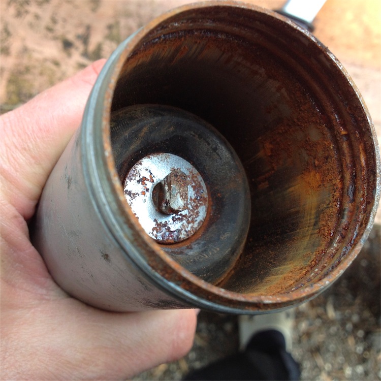 Dann die Fettpresse aufgeschraubt und der Anblick hat ich mich doch gleich sehr an meine Brennräume erinnert ... Dateianhang: