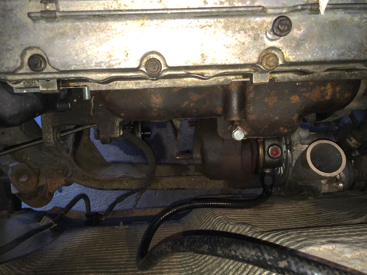 So, wir waren in den letzten Wochen nicht untätig! Es ist einiges passiert, als erstes wurde mal der Innenraum wieder komplettiert, d.h. alle Instrumente und die Mittelkonsole sind wieder drin. Im Prinzip ist der Wagen von daher “fahrfähig”  Leider vergessen Fotos zu machen, aber das ist auch alles noch viel zu dreckig. Vor ein paar Wochen haben Markus und ich dann den Lader mit dem Krümmer verheiratet (Gun Gum hilft  ) und das Teil reingewuchtet. Dann den Zylinderkopf wieder drauf und das war’s dann erstmal. Dateianhang: