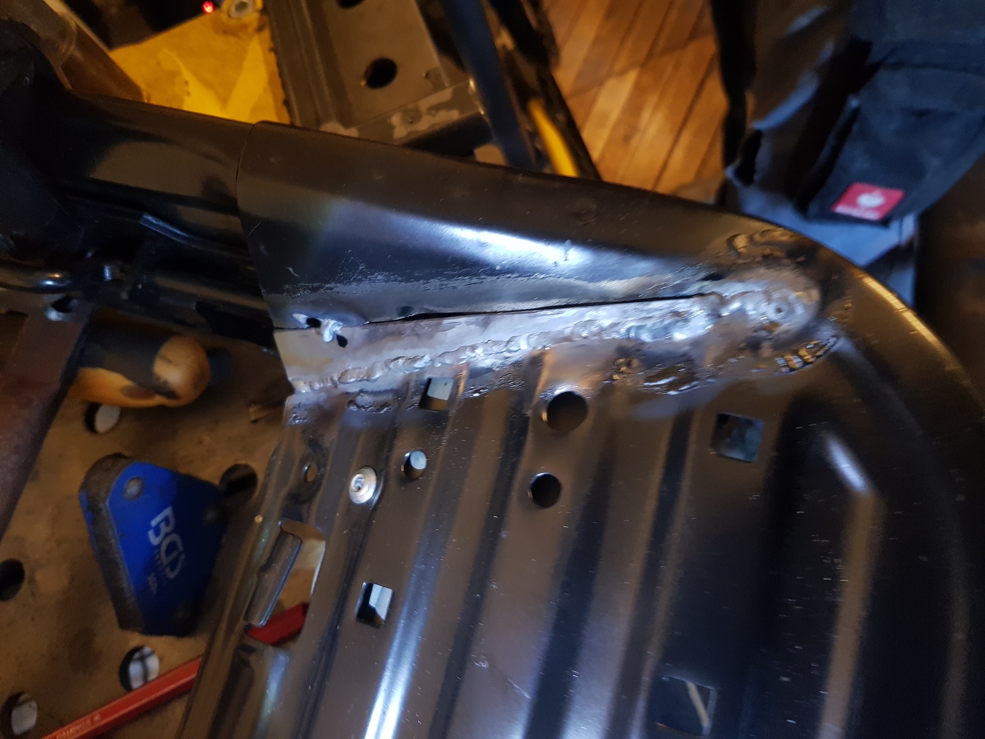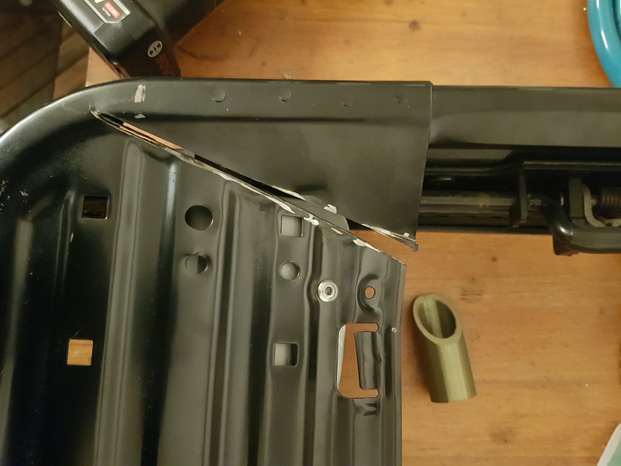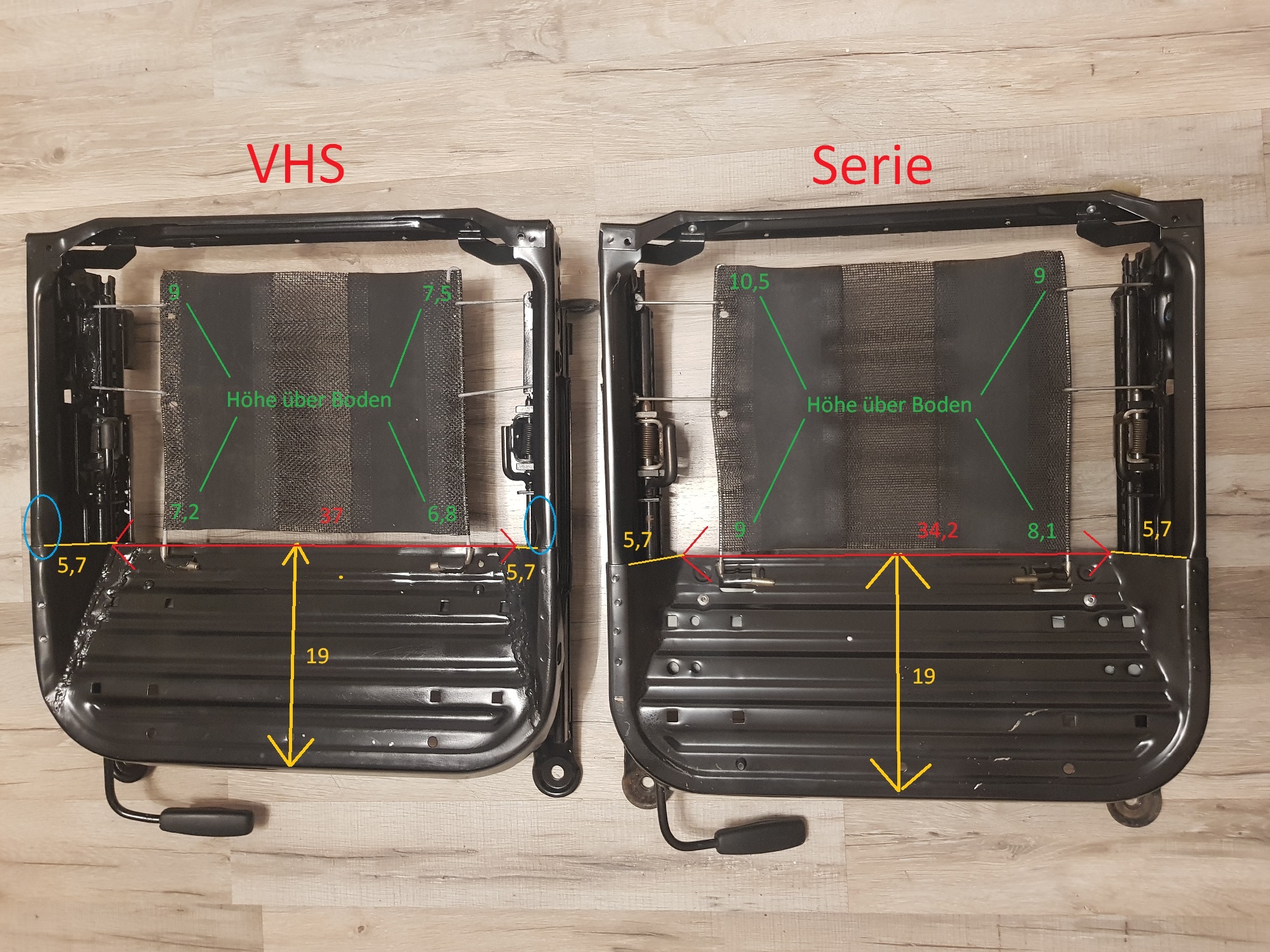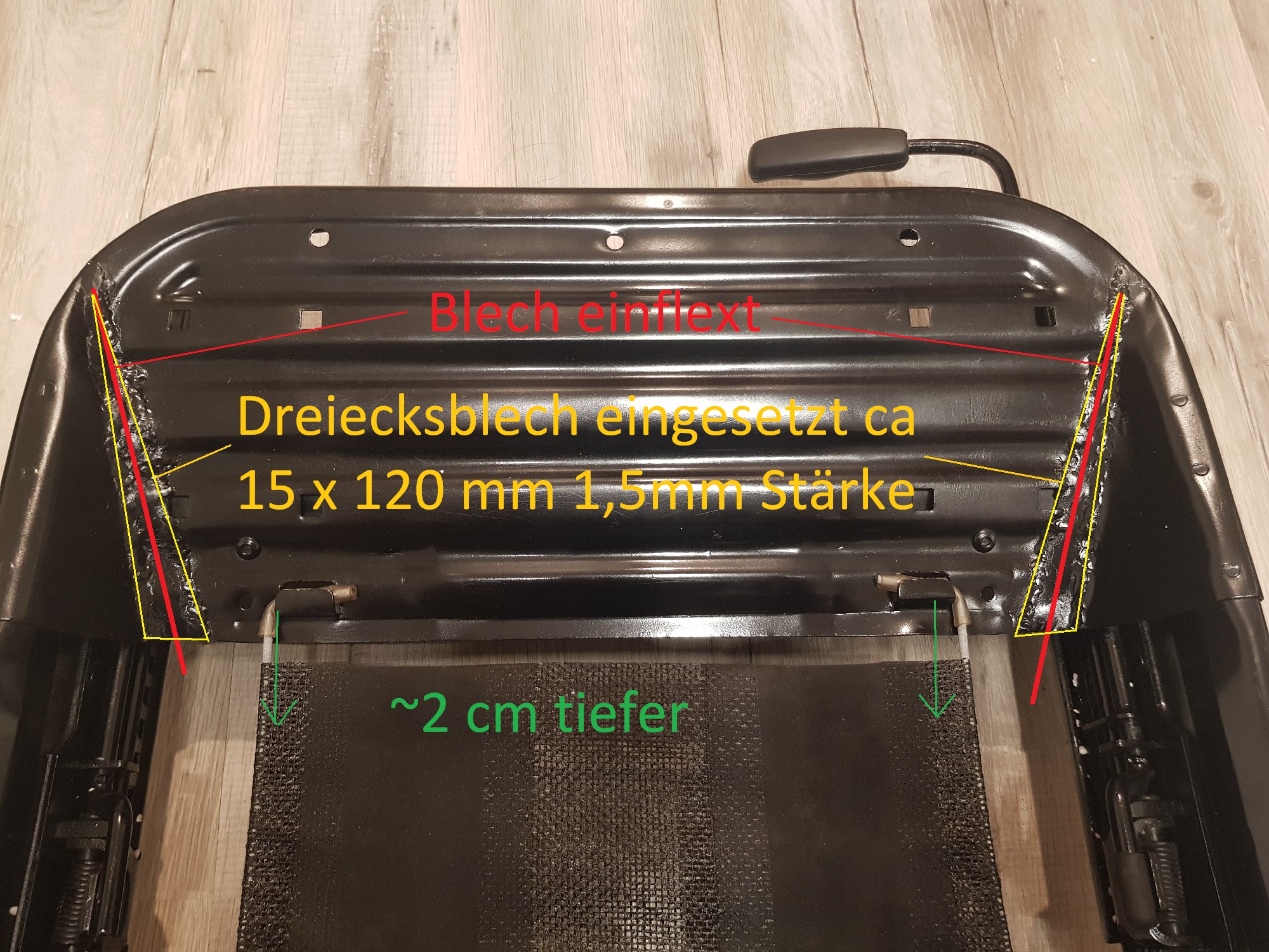 Die Gestelle sind beide Unterschiedlich verzogen, daher musste ich Sie durch mein Gewicht für die Messungen niederdrücken auf alle 4 Aufnahmen. Bitte nicht wundern das die Maße nicht einheitlich sind, durch die Aufnahmelöcher im MG sind die Sitze auf ebener Fläche nicht gerade. Man kann nur die Absolutwerte vergleichen. => In Summe 1,5 bis 2 cm tiefer das VHS Gestell. A bit of reverse engineering...=> Die Bleche wurden wie oben angedeutet im Knick eingeschnitten/ eingeflext. => Dann wurde am eingezeichneten blauen Kreis eine starke Kombizange oder ähnliches angesetzt um die Dreiecksbleche maximal nach unten zu biegen bis sie an den Sitzschienen nahezu anliegen. => das Schräge Blech wurde dann stärker nach unten gebogen, dabei wurde es nicht wesentlich verlängert wie ich erst dachte. (Länge bleibt ungefähr gleich zur Front). => Dann wurden offenbar Dreiecksbleche wie oben eingezeichnet eingesetzt. Längendifferenz durch 2 ergibt eine Breite des Dreiecksblechs von ca. 1,5 cm (geringe Überlappung zum Schweißen vorhanden und ggf. auch notwendig). => das ganze wurde dann verschweißt => Hinten wie oben bereits beschrieben 2x 2mm Bleche angeschweißt. Ich werde im nächsten Schritt mal meinen Fahrersitz aus dem MG ausbauen und schauen ob da ggf. Spiel für eine noch größere Tieferlegung wäre bzw. ob ich inkl. Federn am VHS Gestell schon am Fahrzeugboden aufsetzte... Weil dann gäbe es für Schwergewichte wie mich kein Optimierungspotential mehr. Bilder folgen... Grüße aus Chemnitz