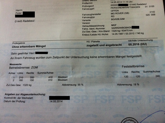 Hi Zusammen, Und wieder 2 Jahre TÜV ohne alles vorher raus zu schmeißen Noch schnell die 17" er endlich eingetragen nachdem ich mit dehnen schon 3/4Jahr rumfahre Ach ja einziger kleiner Mängel: Abgasrohr leicht undicht.  weil das Flexrohr deutlich resselt Damit kann ich leben Gruß Fabian