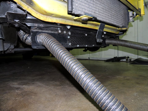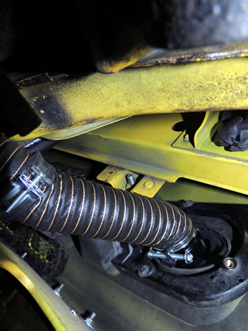 also durch den innenkotflügel von vorne, oder noch besser in das hitzeschutzblech hinter der scheibe ein loch schneiden, und den flexschlauch in entsprechender länge (damit man lenken kann) direkt da befestigen...