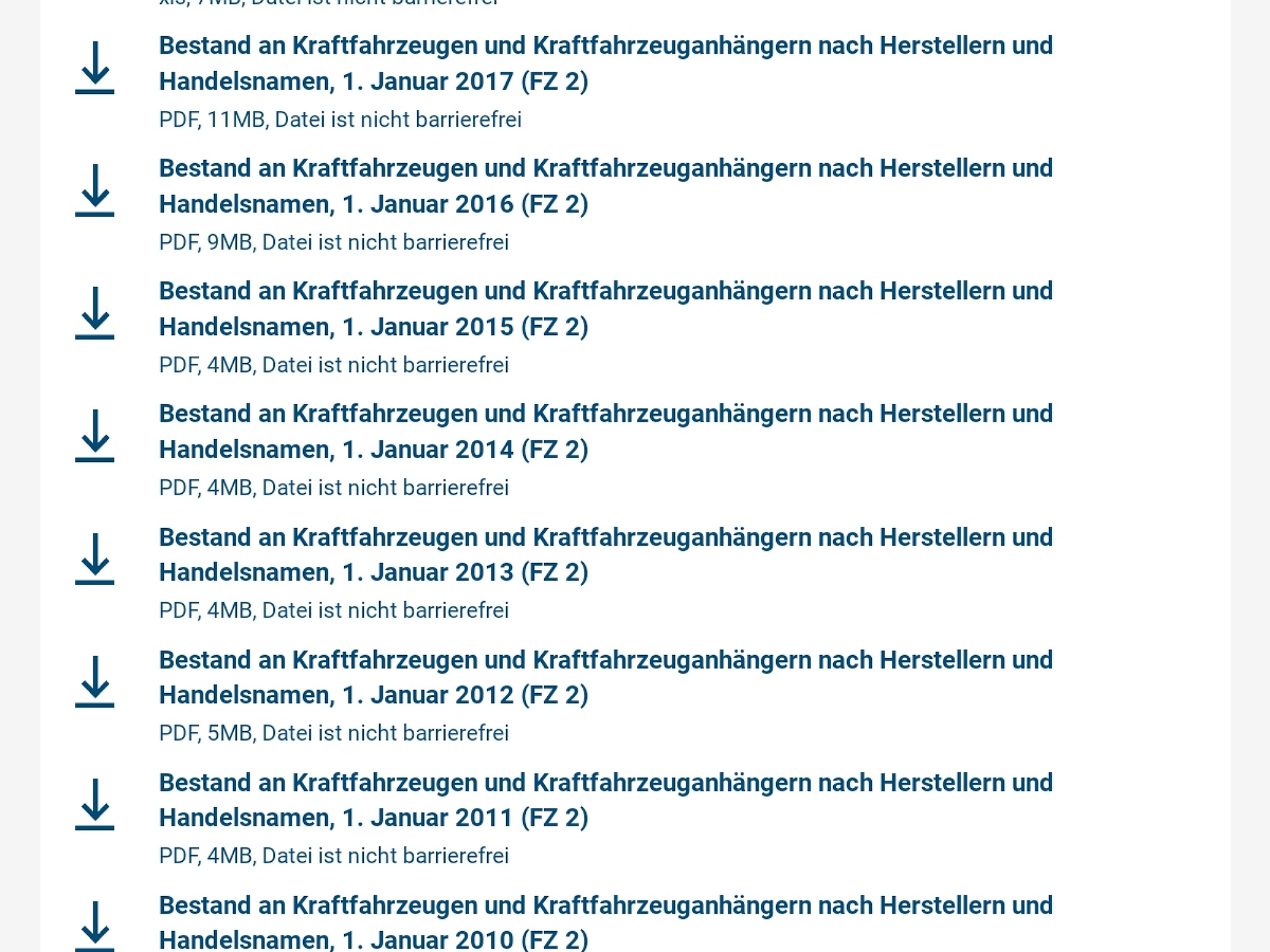 Ich bin auf der Seite zum ersten mal; ist das der richtige link oder sind das alte Zahlen? https://www.kba.de/DE/Statistik/Fahrzeuge/Bestand/MarkenHersteller/b_marken_hersteller_inhalt.html?nn=2601598Die Gesamtzahlen (FZ17) scheint schon raus zu sein, die konkreten Zahlen mit Modellen (FZ2) für 2020 scheinbar noch nicht. Grüße aus Chemnitz
