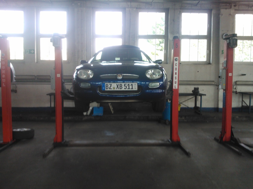 Vielleicht missverstehen wir uns Peter. Ich will die Bühne an die Längsstreben der beiden Hilfsrahmen ansetzen ( in der Handbuchzeichnung 7 und 6). Wenn ich dich richtig verstehe meinst du ich soll an den Punkten 4 und 3 ansetzen. So habe ich es bisher gemacht (Siehe Bilder dieses Threads). Nur habe ich hier gelesen das alle tunlichst vermeiden am Schweller anzusetzen. Die Gummis der Hebebühnen der Selfmadewerkstatt haben auch keine passende Nut. Da müsste ich noch 3 weitere kaufen von den Dingern die oben auf dem Rangierwagenheberbild zu sehen sind. Wenn du meinst das das geht, dann wäre das sicher die einfachste Variante. Weil prinzipiell lassen sich die Teller der Hebebühne sehr tief runterschrauben sodass ich immer an die Schwellerpostion 3 und 4 rankomme. Matthias_S hat geschrieben: Ist doch Jacke wie Hose, wie herum man das Auto auf diese Hebebühne stellt. Die ist dich symmetrisch aufgebaut. Allerdings ist die Bühne in deiner Werkstatt nicht von der stabilsten Sorte. Hm, die 16 Elektro-Hebebühnen in der Werkstatt sind alle unsymmetrisch aufgebaut. Das heißt es gibt zwei lange und zwei kurze Teleskop-Ausleger. Die Eigentümer wollen halt, dass der Teil des Fahrzeugs der schwerer ist (Motor) immer auf den kurzen Auslegern hängt (Hebelarm). Die Hebebühnen sind tatsächlich alle schon sehr alt und knattern ziemlich. Dafür ist 7,50 €/Stunde inkl. Werkzeug in Ordnung. Nur für Flex/Schweißgerät und Altölentsorgung zahlt man drauf. Der Mechaniker im Video ist übrigens mein Kommilitone der sich dort Selbstständig gemacht hat. Wobei der hat keine MGF Erfahrung.
