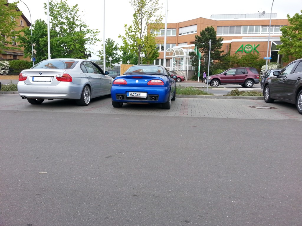Heute direkt bei mir um die Ecke genau der selbe wie meiner  Lentzeallee gegenüber dem Marx-Planck-Institut Berlin Ein BRG-F'chen. Wahnsinnig tief (entweder ein anderes Fahrwerk oder kaum noch Flüssigkeit) und hatte das MG-Logo auf dem Armaturenbrett rot angemalt/lackiert.