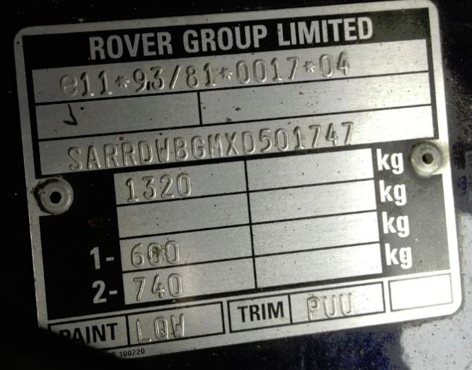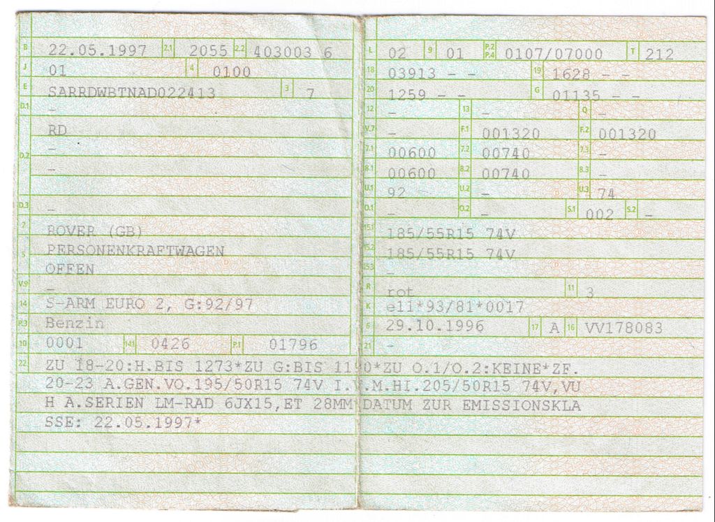 Brauchst die Motornummer auch? SARRDWBTNAD022413 hab ich alles ... wie folgt: VVC 25.3.1997 vom Band gerollt und am gleichen Tag geliefert 23.4.1997 nach D importiert Motornummer 18K4KJ90 470690 CAQ Nightfire Red Pearlescent LQR Teileder Sitze. LHD