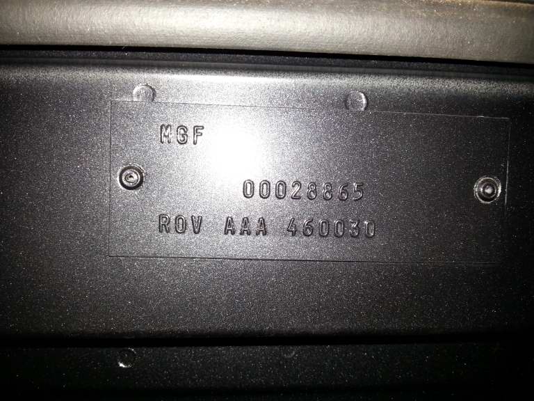 MPI Vorn: E11*93/81*0017*02 SARRDWBGMWD028938 MPI Kofferraum: MGF 00028865 ROV AAA 460030 ------------------------------------ 16.10.1997 vom Band gerollt 20.10.1997 ausgeliefert 06.11.1997 nach D exportiert MGF TL5 K1.8i 120ps Man Motornummer 18K4FJ31 590333 LVD Charcoal Metallic PUU Black Leather ********************************* VVC Vorn: E11*93/81*0017*04SARRDWBTNXD500475 VVC Kofferraum: MGF 00042450 ROV AAA 460030 ----------------------------- 07.09.1998 vom Band gerollt 15.09.1998 ausgeliefert 12.10.1998 exportiert nach D Motornummer 18K4KJ90 124278 LQW Anthracite Metallic WEW Lightstone Leather Der 42298. MGF wenn man alle Vorserien mitzählt Falls noch vorhanden hätte ich sehr sehr gern gelegentlich eine vollständige Kopie des alten KFZ Briefs ? Die drei Seiten mit den technischen Daten und dem Approval Datum in Bristol rechts aussen.  Für die Akten, der fehlt mir nämlich in der Sammlung für Anmeldungen beim DMSB *03 und *05 usw hab ich, *04 fehlt  Siehe auch http://www.mgfcar.de/approval/