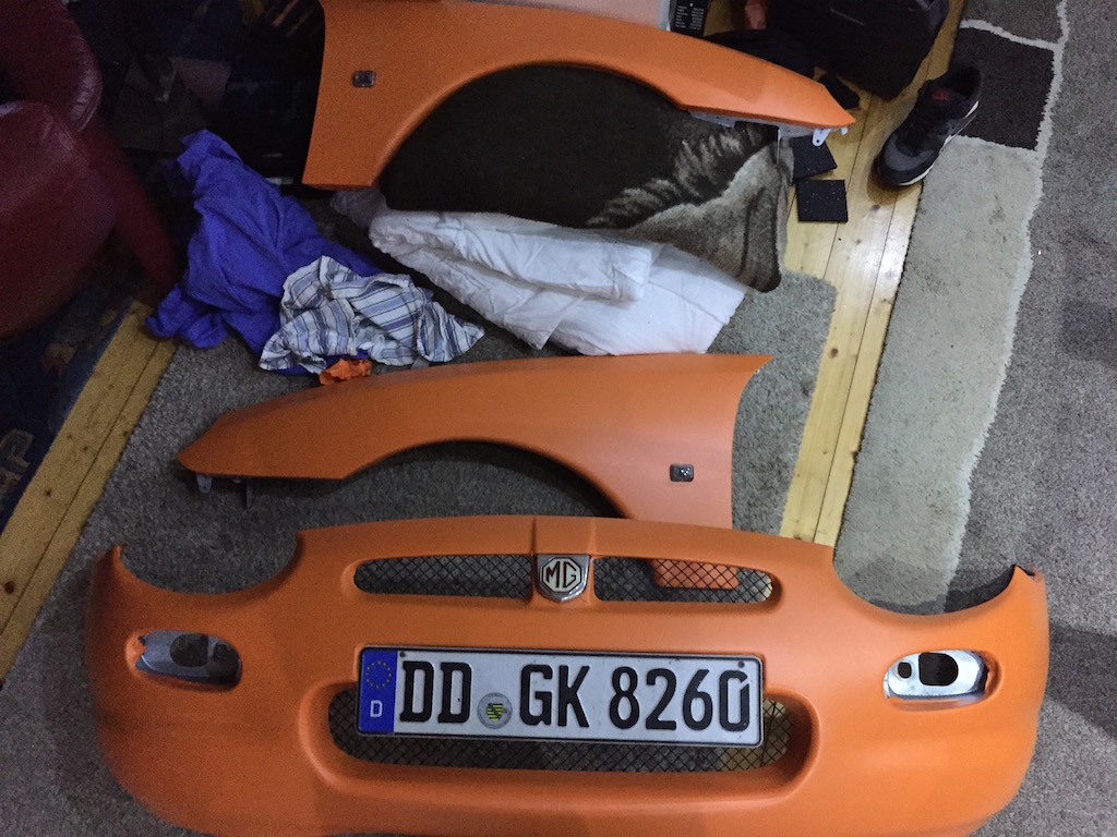 Da der Vorbesitzer meines Fs entweder selbst mit der Dose lackiert, oder einen blinden Lackierer beschäftigt hat und ich ohnehin einige Roststellen entfernen musste, habe ich mich dazu entschlossen meinen Kleinen zu folieren! Eine Vollfolierung vom Profi hätte n tausender gekostet, was für mich definitiv nicht drin ist, also versuche ich es jetzt selbst. 11m Folie für 80€ ist kein allzuhohes Risiko  Nachdem ich also die Roststellen entfernt, gespachtelt und grundiert hatte, habe ich noch die Kotflügel mithilfe von GFK rekonstruiert, die waren doch schon weit durchgefault: (selbstverständlich das GFK noch gecutted, gespachtelt und grundiert)  Habe mich für ein orange Matt entschieden, ist mal was anderes und finde ich ganz cool Kotflügel waren relativ leicht zu folieren, Motorhaube war jedoch extrem schwierig und als absoluter Anfänger musste ich leider auch recht viel Flicken..  Da es hier derzeit ohne Unterlass regnet, kann ich nicht weiter machen, da ich nicht das ganze Auto ins Wohnzimmer stellen kann, aber die 3 Teile die bereits fertig sind würde ich trotzdem gerne mal zeigen  Hat das schonmal jemand selbst gemacht?:) lg TheResistance
