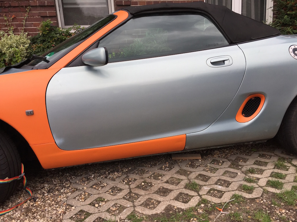 So, hier mal ein kleines Update: Einstieg + Schneller links, sowie A Säule links sind jetzt auch orange. Einstieg war deutlich schwieriger als erwartet, demontage der Tür macht das ganze sicher um längen einfacher. Leider hat es dann angefangen zu regnen, da konnte ich nurnoch schnell die Einlässe abbauen und drinnen foliieren, sonst wäre ich sicher weitergekommen. Links hab ich auch schonmal den Kotflügel montiert, man kann also so langsam erahnen wie es dann mal aussehen wird