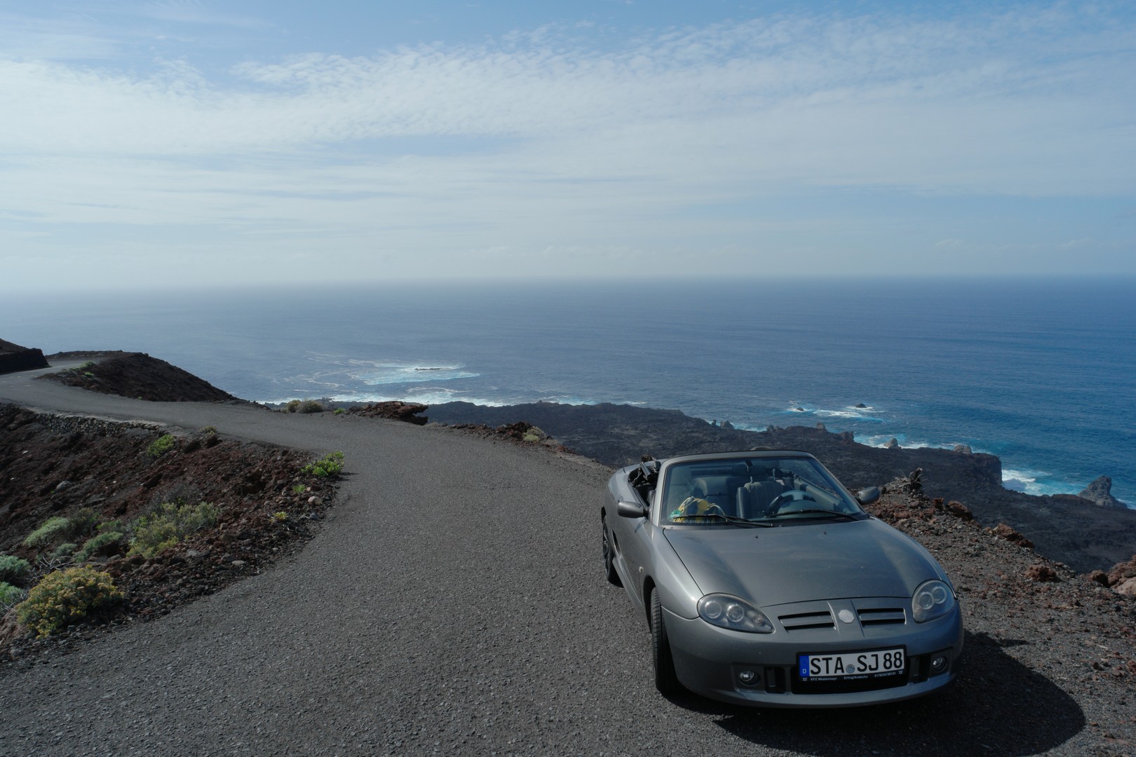 Hallo liebe MGler, ich möchte hier mal äußerst positiv zu unserem geschätzten Fahrzeug schreiben Seit letztem September bis diesen Februar habe ich eine lange Reise mit meinem MG TF Spark, BJ 2004, unternommen, quer durch Südwesteuropa. Angefangen relativ schnell durch den Schwarzwald, über Landstraßen durch die Schweiz und Frankreich bis zur Mittelmeerküste Spaniens. Mein Plan war Spanien und Portugal zu entdecken, deswegen ging es dann über die Pyrenäen bis zur Atlantiknordküste Spaniens und hinunter über Portugal bis letztlich per Fähre auf die Kanarischen Inseln. Dort durfte er das erste Mal im 'Winter' fahren. Insgesamt ein halbes Jahr mit ca. 12000 km Fahrt in Summe. Hier die Tour: https://de.mapy.cz/s/karezovusuEs ging über holprige Straßen und enge Gässchen, immer Abseits des Trubels und von Städten und meist auch nur durch wenig touristische Ecken. Hab mich vorher noch ordentlich über extra Plus Mitgliedschaft bei einem Automobilclub abgesichert aber glücklicherweise nie benötigt. Nie gab es irgendwelche Probleme mit dem Auto. Obwohl ich schon mal mit der Zurröse aufgesetzt habe oder ähnliches kam er völlig unbeschadet wieder zurück. Die lange und intensive Sonne hat zwar den Scheinwerfern und auch dem Verdeck etwas zugesetzt, aber das wars auch schon. Nur am Hafen von Teneriffa hab ich mir irgendwo einen Platten eingefahren, konnte ihn aber notdürftig mit Flickset mit kleinem Kompressor soweit flicken, dass ich die Fähre noch nehmen konnte. Ich musste dann auf einer der abgelegensten Inseln Europas auf El Hierro einen kompletten Satz neue Reifen aufziehen lassen, da sie hinten platt und vorne schon keilförmig abgefahren waren. Aber selbst das war trotz der unüblichen Reifengrößen kein Problem. Hat allerdings eine Woche gedauert und ich hab 'nur' die Nexen N´Fera Primus bekommen, aber immerhin. Die Kommunikation war etwas kompliziert mit meinem noch rudimentären Spanisch, aber ging schon. Im Wagen war jeder Zentimeter genutzt, ich hatte hinten im Kofferraum meine Klamotten und das komplette Camping Equipment mit Zelt, Isomatte, 2 Schlafsäcken für unterschiedliche Temperaturen. Vorne waren Schuhe und Elektronik wie kleines Laptop und Ladegeräte. Im Beifahrerfußraum eine Mini-Kühlbox und Camping-Kocher und Zubehör. Beifahrersitz war reserviert für Lebensmittel. Viele meiner Kollegen und Freunde haben mich für etwas bescheuert gehalten, so eine lange Tour mit dem kleinen Auto zu unternehmen. Klar, die sind vielleicht Wohnmobil oder Bus verwöhnt. Aber genau das wollte ich nicht. Zum Einen habe ich nur den MG als Auto, zum anderen wollte ich so minimalistisch wie möglich unterwegs sein und gleichzeitig die Landschaft und Straßen bestmöglich genießen können. Und ich sage Euch, was für geile Straßen! Ganze Pässe hatte ich für mich alleine bei bestem Teer, ich hab das Grinsen lange nicht mehr aus dem Gesicht bekommen. Leider hat das Treffen mit den spanischen MGlern nicht geklappt, ich war erst zwei Wochen nach deren Tour in der Region, aber auch so war es immer spannend. Ich habe während der ganzen Reise aber andere MGler (2x MGB) getroffen, mit denen man sich über die 'geilen Karren' unterhält, auch Leute aus Wales, die bei MG gearbeitet haben etc. . Oft bin ich angesprochen worden und so sind einige nette Bekanntschaften entstanden, auch mit Motorrad Gruppen auf Tour. Die 1,5 Monate Anreise mit viel Zelten war zwar irgendwo auch anstrengend, aber positiv. Ich hatte Glück mit dem Wetter und meistens konnte ich das Zelt komplett trocken wieder einpacken, ansonsten wurde es ja meist am Nachmittag schon wieder ausgepackt. Das viele Umräumen im Kofferraum war zwar manchmal nervig, aber es ging immer irgendwie. Anschließend auf den kanarischen Inseln war ich immer in Unterkünften, ab Dezember dann auch mit meiner Frau zusammen, die mit Flugzeug nachgekommen ist. Dann wurde es kuschlig im Auto, aber mit Rucksack auf dem Schoß konnte sie sich für die Stunde Fahrt von einer Unterkunft zur nächsten auch anfreunden. Und auf den Inseln bin ich ja meist dann unbeladen gewesen und konnte die Straßen noch entspannter, meist aber flott fahren. Ein Raser bin ich eh nicht, aber ab und zu mal durchtreten macht mir schon noch Spaß. Im Februar bin ich dann relativ schnell über Autobahnen von Südspanien wieder zurück, weil ich mit den Sommerreifen nicht in Schnee kommen wollte in der Nähe der Alpen. War dann recht stressig, aber selbst 900km am Tag für den Kleinen kein Problem. Alles in Allem ein super gelungener Trip und ich bin immer noch froh, dass mich mein MG jetzt fast 18 Jahre begleitet. Für mich gibt es auf dem Markt keine Alternative, ich hab schon fast Sorge, wenn er dann doch irgendwann nicht mehr mag oder die Reparaturkosten unsinnig werden. Zu unserem gemeinsamen 18. Jubiläum im Mai werden wir hier noch eine schöne Ausfahrt machen und ich schenk ihm ne ordentliche Pflege  Wünsche Euch genauso viel Freude mit dem MG! Euer Stefan