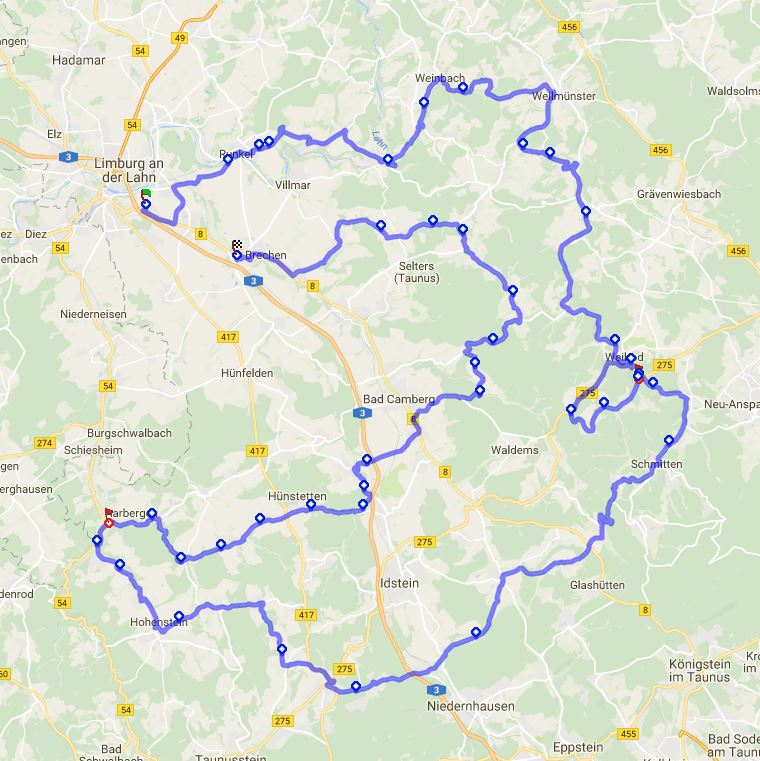 Es geht 170 km auf möglichst kurvigen Strecken durch den Taunus. Den habe ich ja schon oft besungen, aber ich muss es doch nochmal tun: was mich immer wieder freut ist, dass man von sanften Hügeln bis zu (kurzen) Serpentinenstrecken hier alles findet, was uns an unseren Schätzchen Spaß haben lässt. Meine Tourplanung sieht vor: ab halb 11 / 11 Uhr Treffen auf dem Parkplatz vom McDonalds bei A3 Ausfahrt Limburg-Süd Hier gibt's n Kaffee, zur Not noch nen Snack und auch ne große Tanke - und genug Platz um sich mit vielleicht max 10 Wagen zu treffen. Verkehrsgünstig ists eh. Und falls es am Ende doch mehr werden, zur Not dann halt 500m weiter auf nem Supermarktparkplatz - dann muss man die Bedürfnisse eben vorher befriedigen  gg halb 12 dann Abfahrt zunächst geht es auf gemächlichen Straßen - mit allem was man sich nicht wünscht (Blitzer, Ampeln, Stopschildern und so) bis nach Runkel - aber das schaffen wir schon - und dann haben wir es auch hinter uns (außer Blitzer.......). Hier einmal durch die pittoresque Stadt, der Burg im Fahren zugewunken und dann ab auf die kleinen Landstraßen --- Aumenau - Weinbach - Weilmünster bis Weilrod und dann noch einen kleinen Schlenker - und dann... so gg 13 Uhr dann Ankunft in der Landsteiner Mühle zum Mittagessen. Die Landsteiner Mühle ist hier ein beliebtes Ausflugsziel und bietet 'kreative hessische Küche' - und hat sich Apfelwein so ein bisschen zum Thema gemacht - wer drauf steht, sollte hier einplanen vielleicht ein zwei Flaschen mitzunehmen. Für uns Fahrer: auch die Apfelschorle ist super! Und das essen eh...bei gutem Wetter Sollte man auch draußen sitzen können - und das ist schönster Landschaft. Aber wir sind ja nicht nur zum Essen da... gg 14 bis 14 Uhr 30 dann weiter 'on tour' - den Feldberg im Panorama mitnehmen (drüber fahren macht bis April Spaß, dann eher nicht...) um über Schmitten - Heftrich - Oberseelbach auf 'die andere Seite des Taunus' (und der A3) zu wechseln und in Maisel flugs wieder in die kleineren Straßen einzusteigen und auf möglichst vielen Umwegen, Kurven, auf und abs, zur B54 zu gelangen, wo wir in Aarbergen gg 15 bis 15 Uhr 30 an einem Eiscafe (im 'Einkaufzentrum' - wegen Parkplätzen) stoppen werden, um etwaige Bedürfnisse zu stillen Sobald wir uns die Füße genug vertreten haben, kämpfen wir uns noch einmal auf meist traumhaften Straßen über Hennetal - Hünstetten - Idstein - Bad Camberg zurück, um am Ende noch die schönen Routen um die Vogelburg mitzunehmen. Dann geht's im Bogen um Selters und über Münster an unser Ziel, welches wir gg 17 bis 17 Uhr 30 mit dem Mühlenkeller in Brechen erreichen. Hier gibt es neben dem durchaus netten Restaurant mit Terasse vor allem nochmal einen großen Parkplatz, wo man sich ganz entspannt verabschieden kann - und wer will trinkt halt noch ein alkoholfreies Weizen und isst ne Pizza...Und ja, verkehrsgünstig ists auch  7 km oder so vom Startpunkt die Straße runter... Jetzt nur noch: gutes Wetter und keine neuen Baustellen, dann wird das ne Runde Sache...aber ist ja auch noch Zeit hin