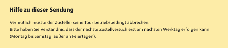 Michael N. hat geschrieben: oder was heißt Betriebsbedingt?. ich vermute es bedeutet: der Zusteller musste sein Tour abbrechen, da Public Viewing heute schon ab 14h.